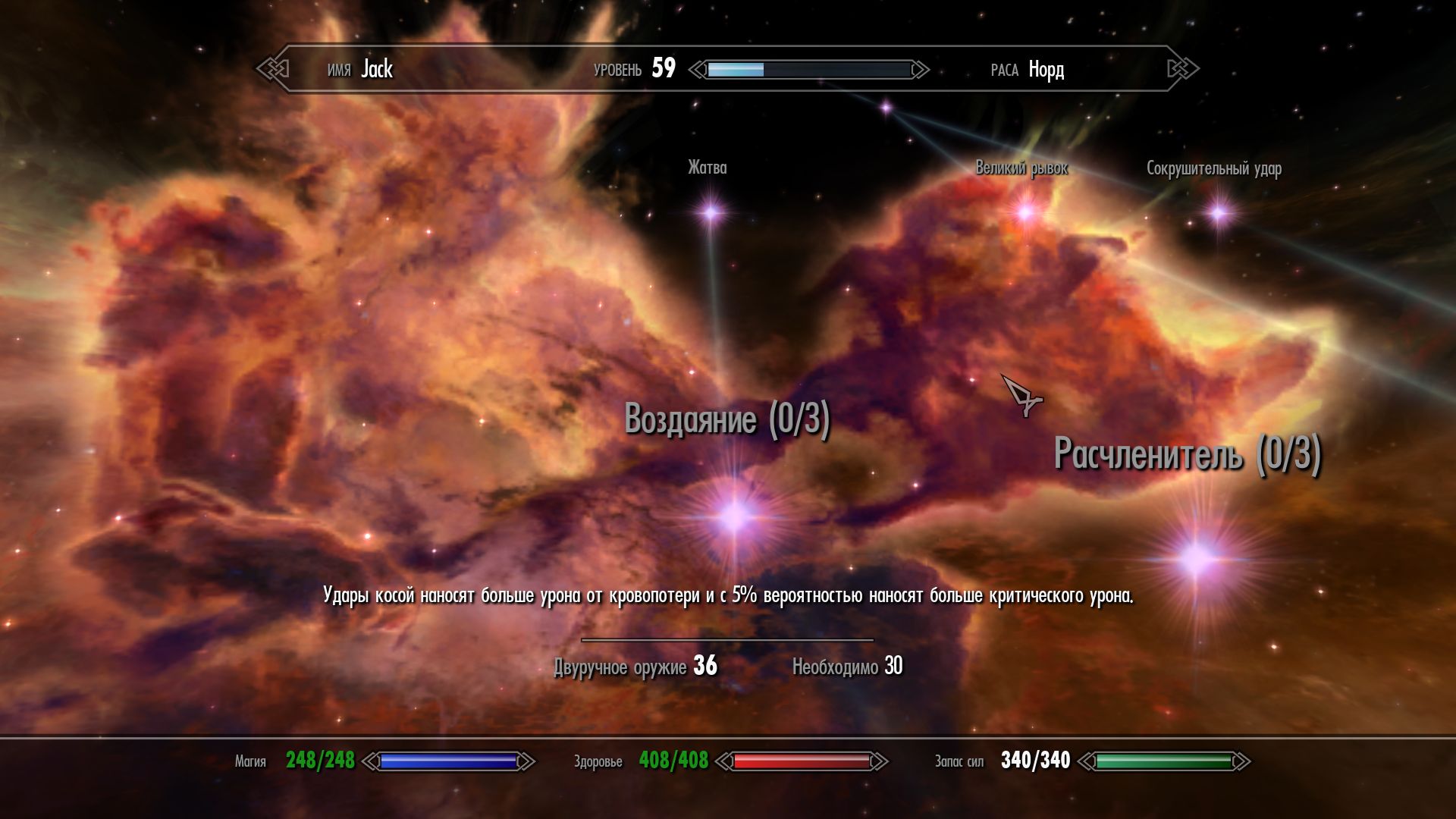 Каждую косу можно выковать в кузнице и улучшить. Мод добавляет драконий череп, который можно заполучить при победе над драконом. Также добавлено несколько новых навыков в древо двуручного оружия. Некоторое оружие может быть найдено у бандитов и в магазинах, помимо того, еще им владеют фермеры около Вайтрана.