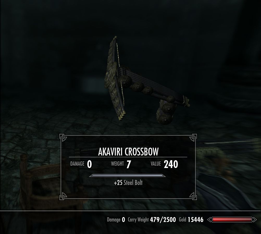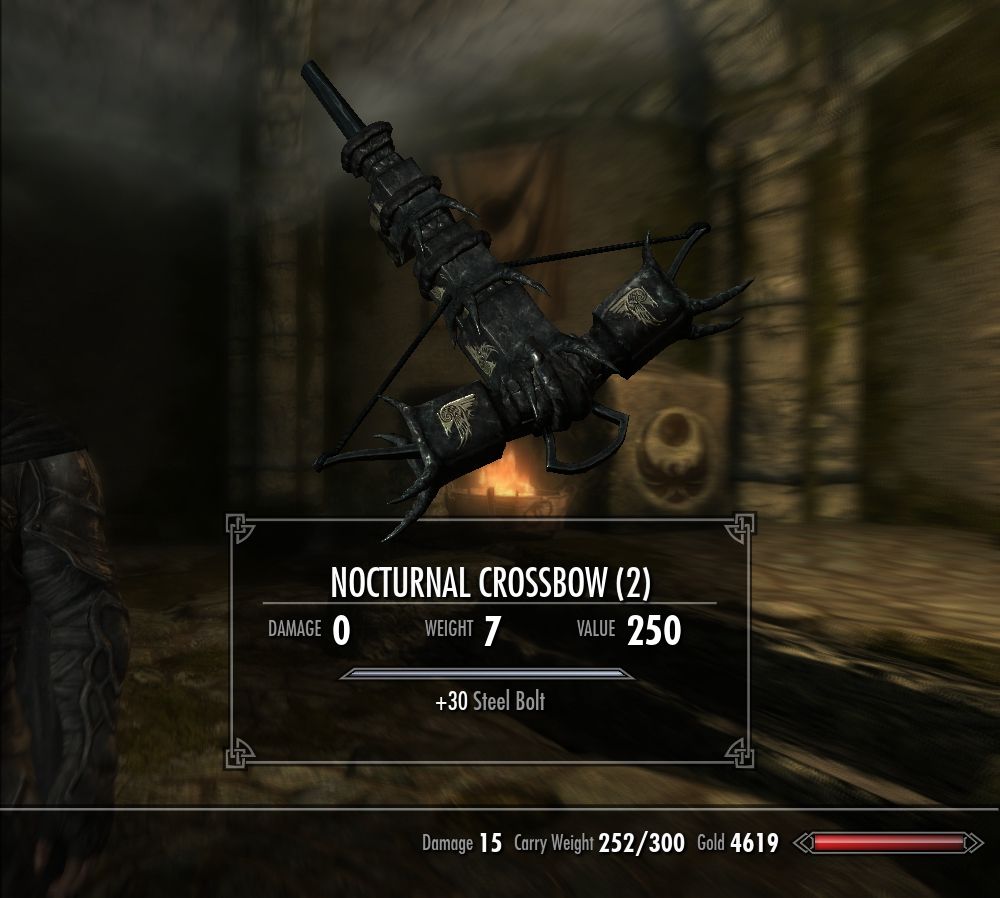 Плагин добавляет в игру одноручные арбалеты. Вы сможете вооружиться двумя арбалетами или же можете комбинировать с их другим оружием, например мечом или заклинанием. Стальной и двемерский арбалет вы сможете купить у некоторых торговцев по всему Скайриму. Уникальный арбалет Ноктюрнал можно найти в Сумеречной гробнице, акавирский арбалет находится в Храме Небесной Гавани. Драконий костяной арбалет создается в драконьем разделе кузницы.