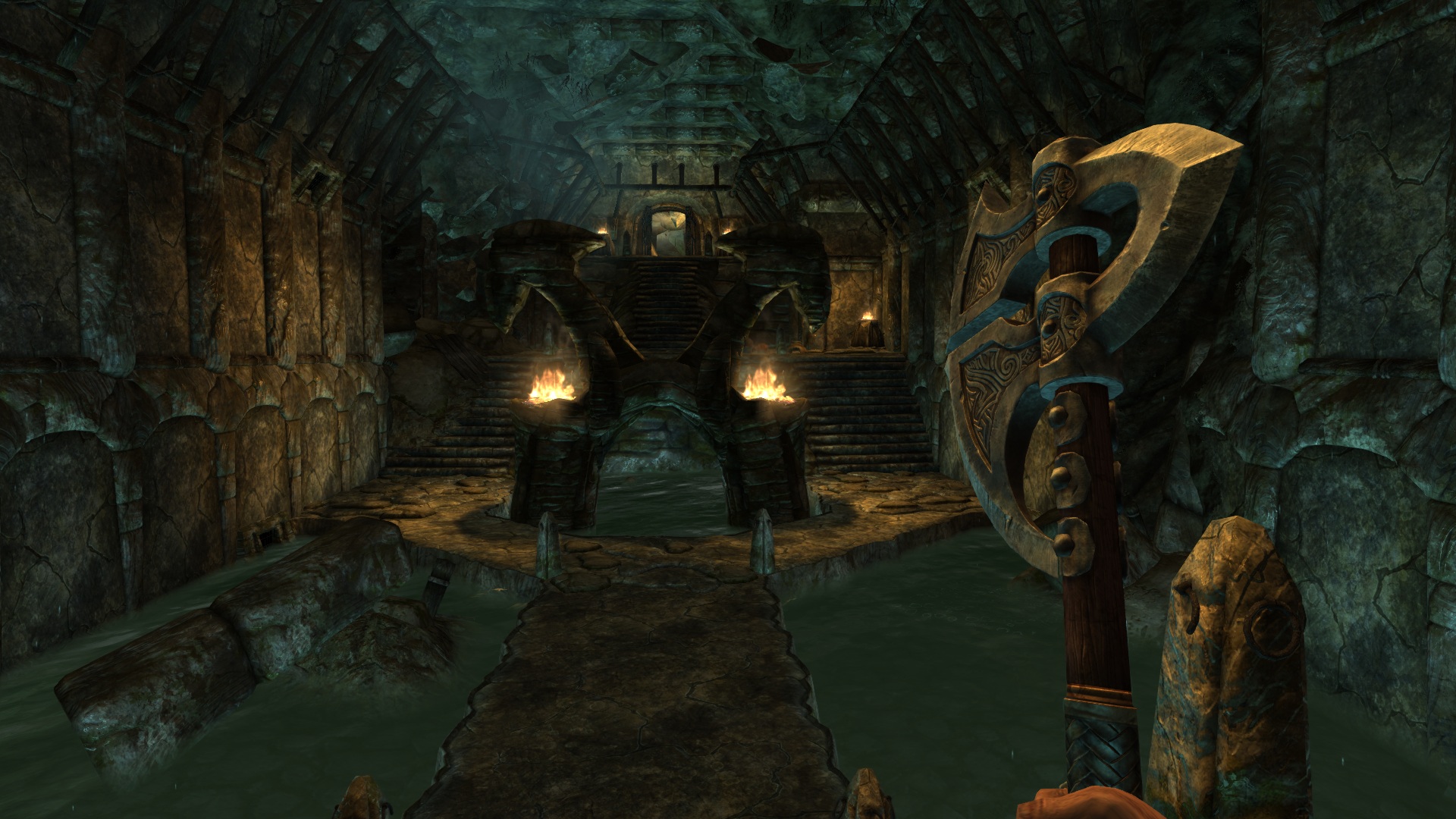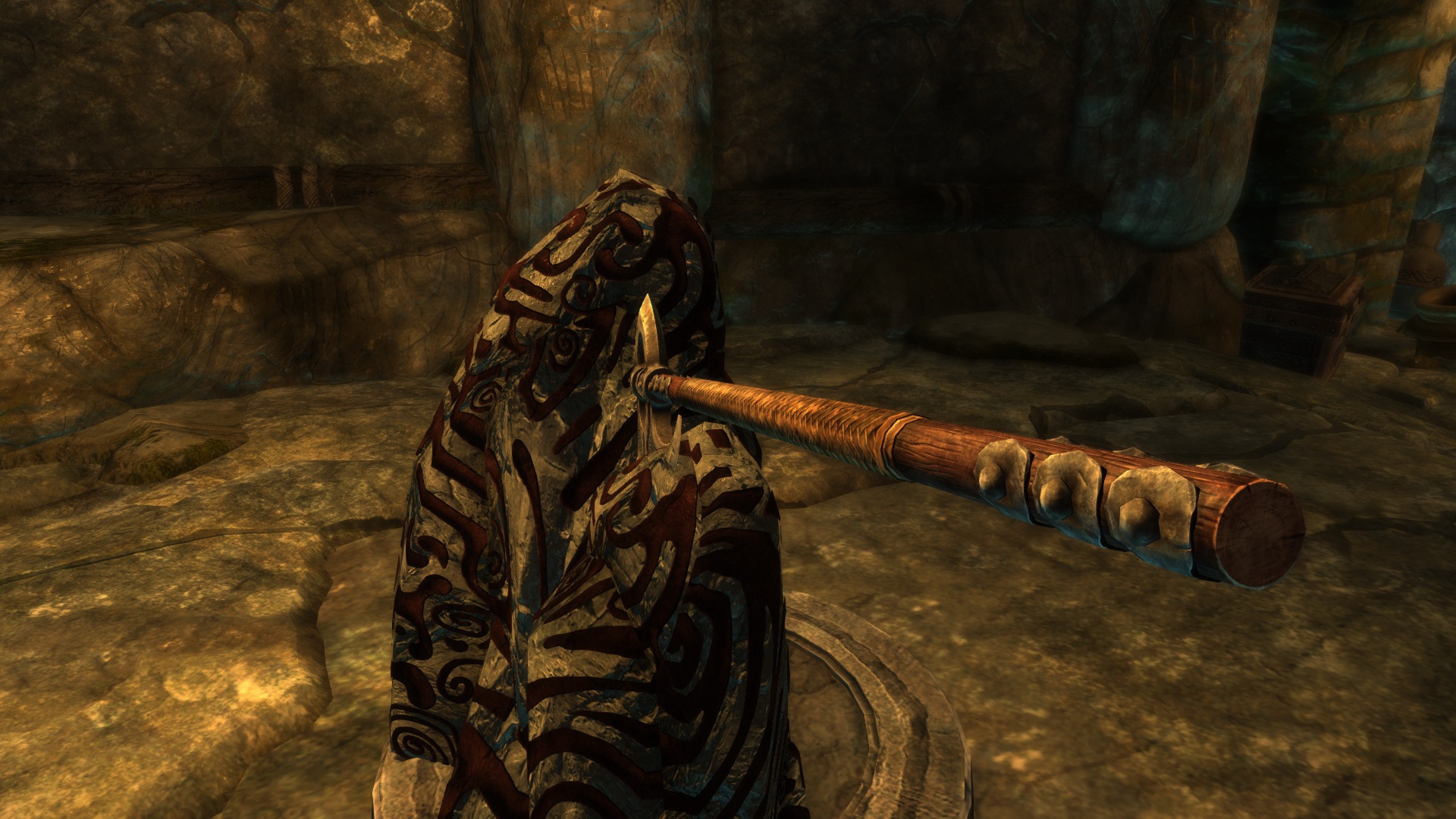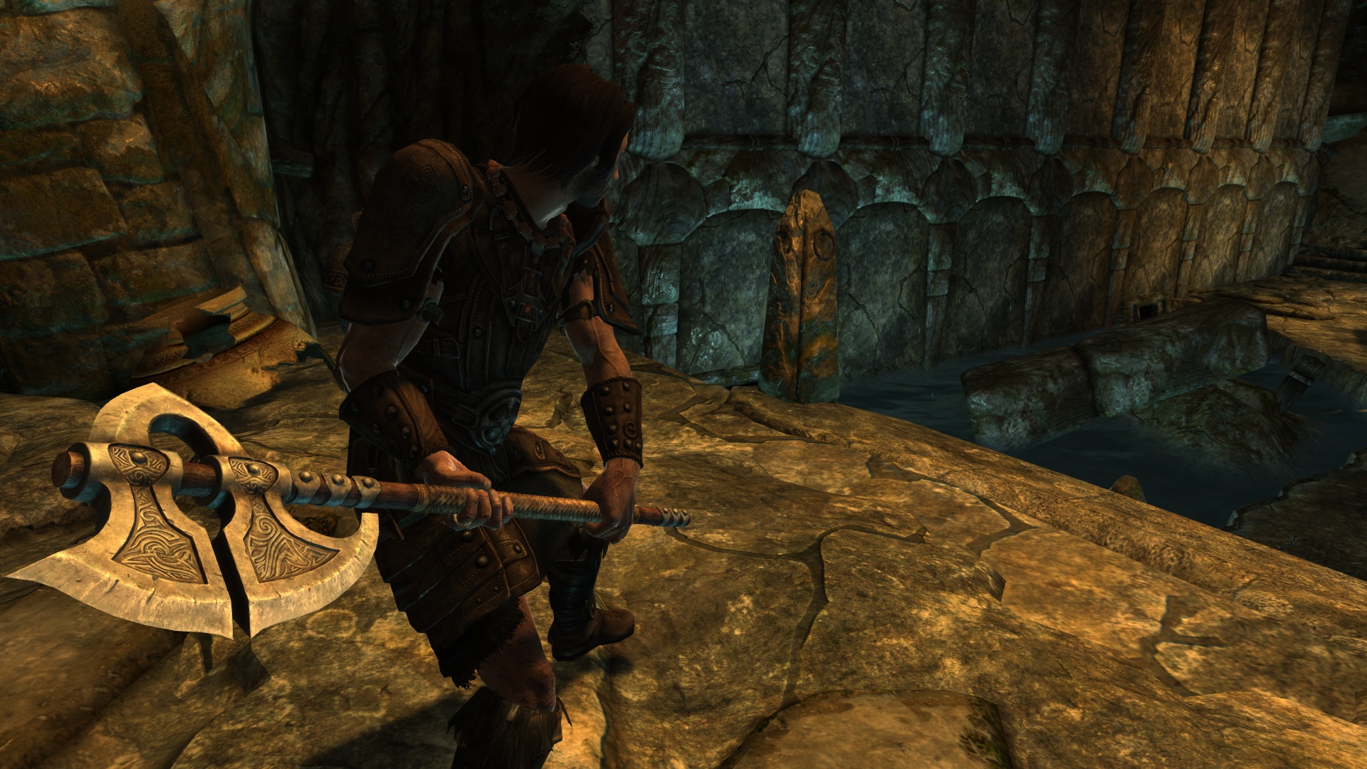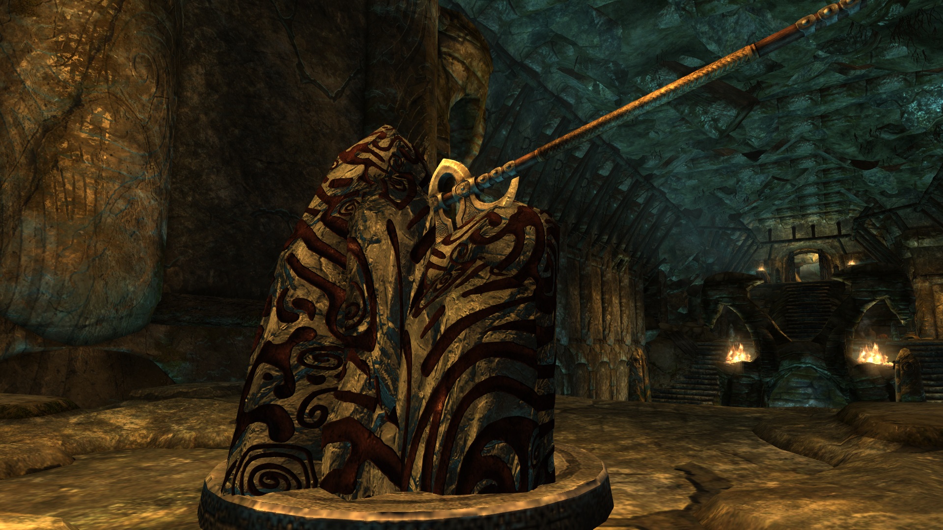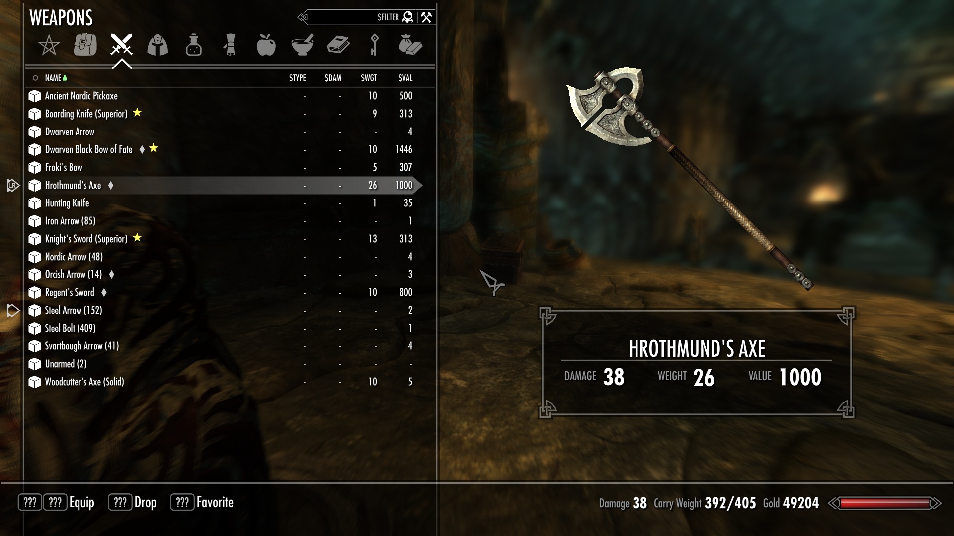 Наверное, каждый забредал в курган Хротмунда и находил там секиру, торчавшую из камня, к сожалению, ее нельзя было взять, но с помощью этого мода теперь вы сможете ее забрать. Топор Хротмунда относится к двуручному оружию. Его нельзя улучшить на точильном камне, но зато можно зачаровать. Урон зависит от навыка двуручного оружия, весит 26, стоимость 1000.