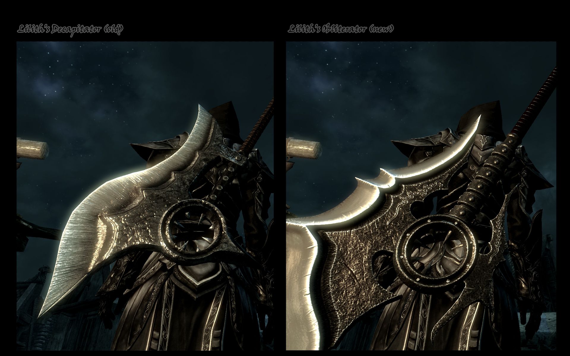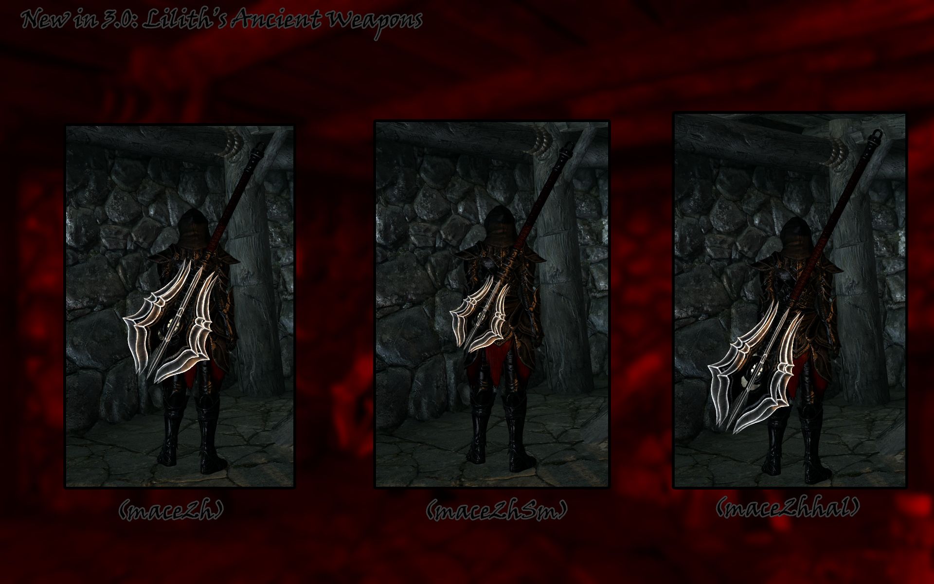 Мод добавляет новые топоры и булавы Лилит, которые вы сможете создать в разделе даэдрического. На выбор представлена целая куча различных вариантов: двуручные и одноручные, большие и маленькие, двухлезвийные и т.д.