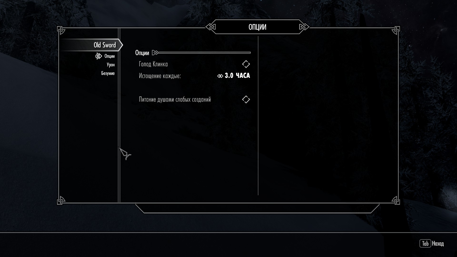 Мод добавляет в игру меч, урон которого растет пропорционально количеству убитых противников (гуманоидов). Имеется пять стадий "сытости" клинка, с наступлением каждой стадии рост урона немного замедляется. Также есть небольшой шанс, того, что при очередном ударе у вас помутится рассудок и вам начнет казаться, что вы окружены врагами. Чтобы получить меч, нужно победить старого офицера к северо-востоку от Виндхельма (Кладбище рядом с Привалом Беженцев).