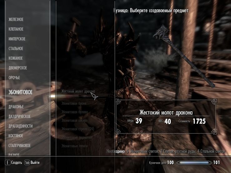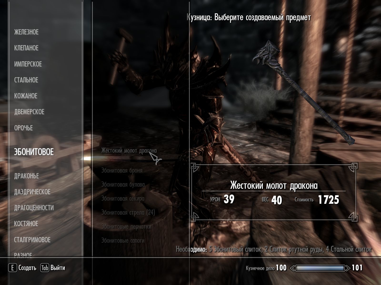Жестокий молот дракона куется в кузнице, в разделе эбонитового, и требует соответствующего перка. Он не зачарован, вы можете зачаровать его самостоятельно.