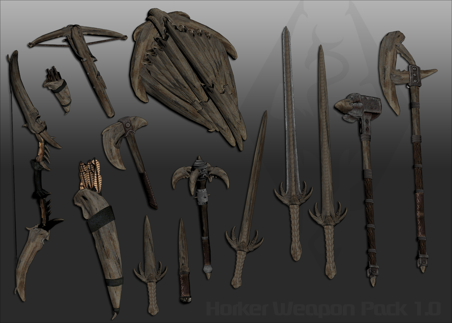 Мод добавляет в игру различное оружие из кости хоркера, которое вы сможете выковать в любой кузнице в разделе разного. У каждого предмета есть 2 варианта (I и II) с различными показателями урона, I = базируется на железных предметах, II = базируется на даэдрических предметах.