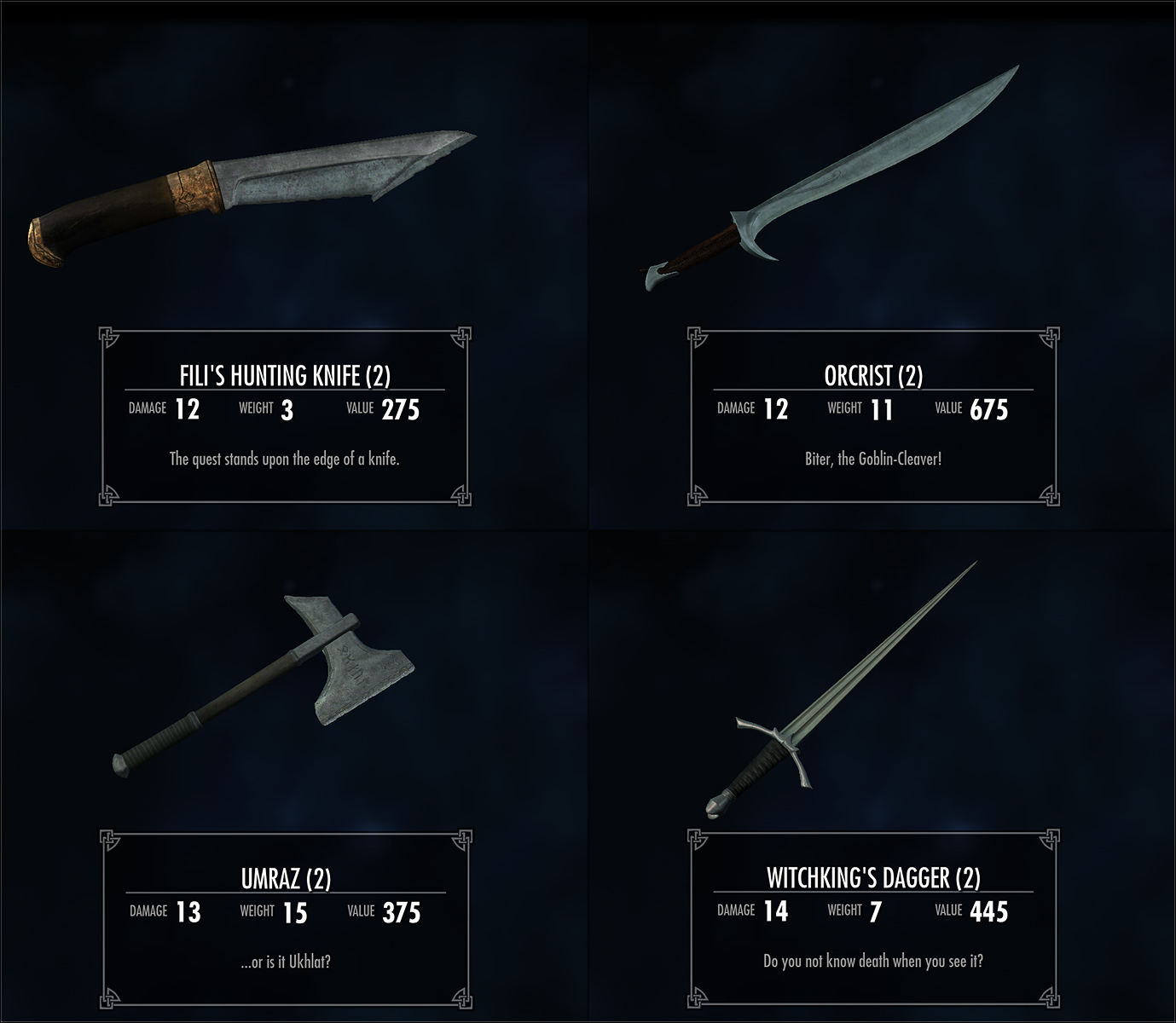 Мод добавляет в Скайрим еще одну порцию оружия из Властелина колец: Оркрист + ножны (меч), Умраз (топор), Охотничий нож Фили + измененные оригинальные ножны (кинжал), Кинжал Короля-чародея + ножны (кинжал). Все предметы создаются в разделе стального.