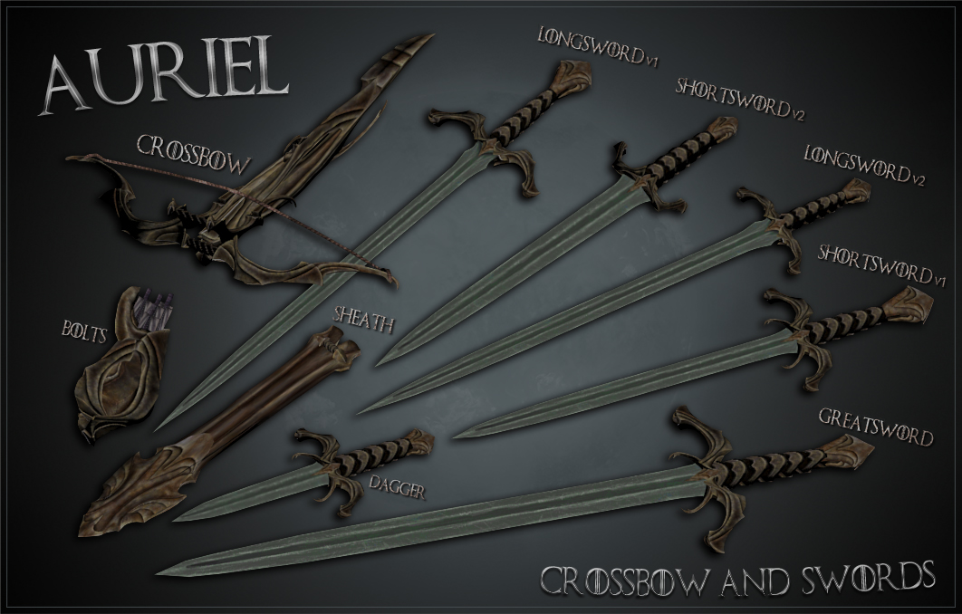 Мод добавляет в игру арбалет и клинки Ауриэля, которые вы сможете найти в сундуке перед статуей Ауриэля, находящейся у храма в Забытой Долине, куда можно попасть в ходе квеста Dawnguard. Стрелы и болты можно выковать в разделе разного.