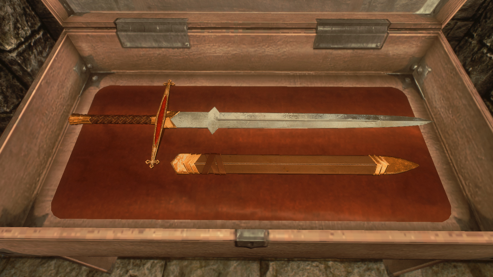 - Помещен в место, соответствующее лору: "Меч принадлежал Имперскому Легиону в Вварденфелле, но был украден дезертиром. По слухам, меч находится где-то рядом с Садрит Морой. Одним из заданий Рыцаря Дракона Вариуса Вантиниуса будет найти и вернуть реликвию обратно. Выясняется, что мечом завладела колдунья-данмерка Драраму Хлоран из пещеры Абанаби, что к юго-западу от Садрит Моры. Нереварин покончил с ворами и вернул артефакт прежним владельцам".