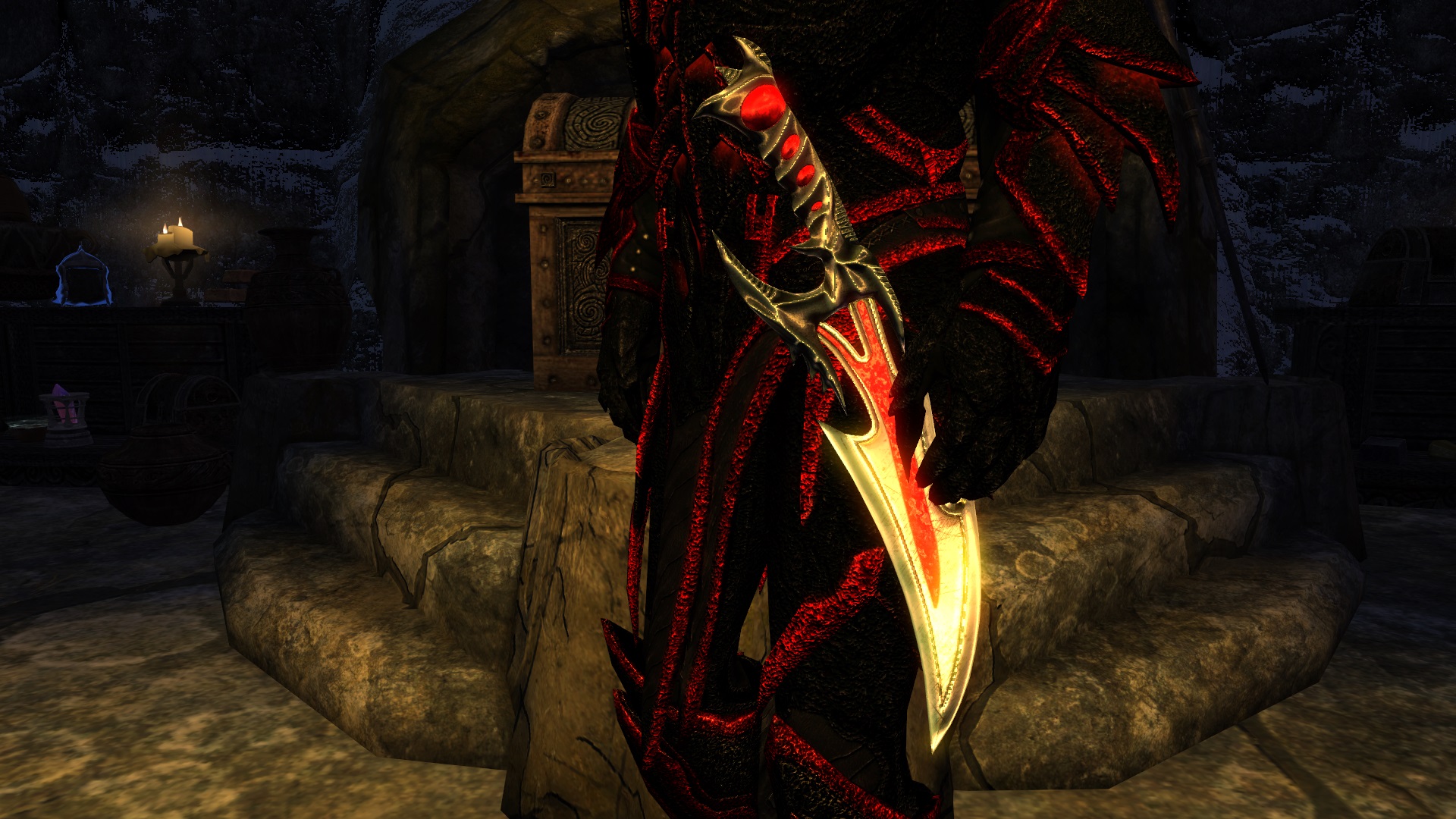 Морровиндский же кинжал можно получить только у Азидала на Солстейме. У него будет такое же зачарование, как у Бритвы Мерунса (не придумал я какого-то уникального зачарования - весь энтузиазм ушёл на создание моделей). И только после того, как вы победите Азидала вы сможете ковать незачарованные копии этого кинжала, но только если освоили даэдрическую ковку. Если же вы уже убили Азидала, то не переживайте - вы сразу же сможете ковать его копии, просто останетесь без ещё одной "Бритвы Мерунеса".