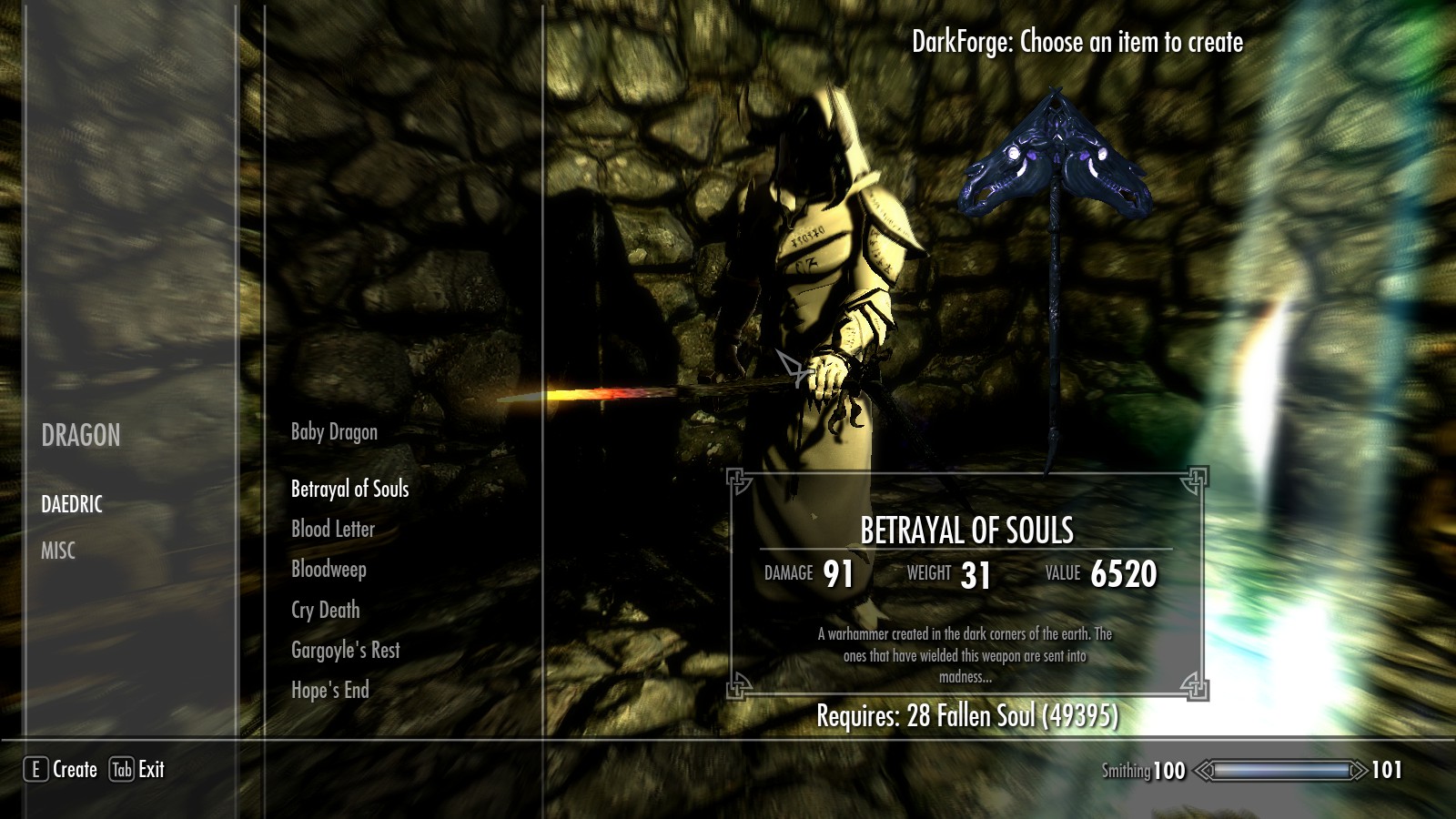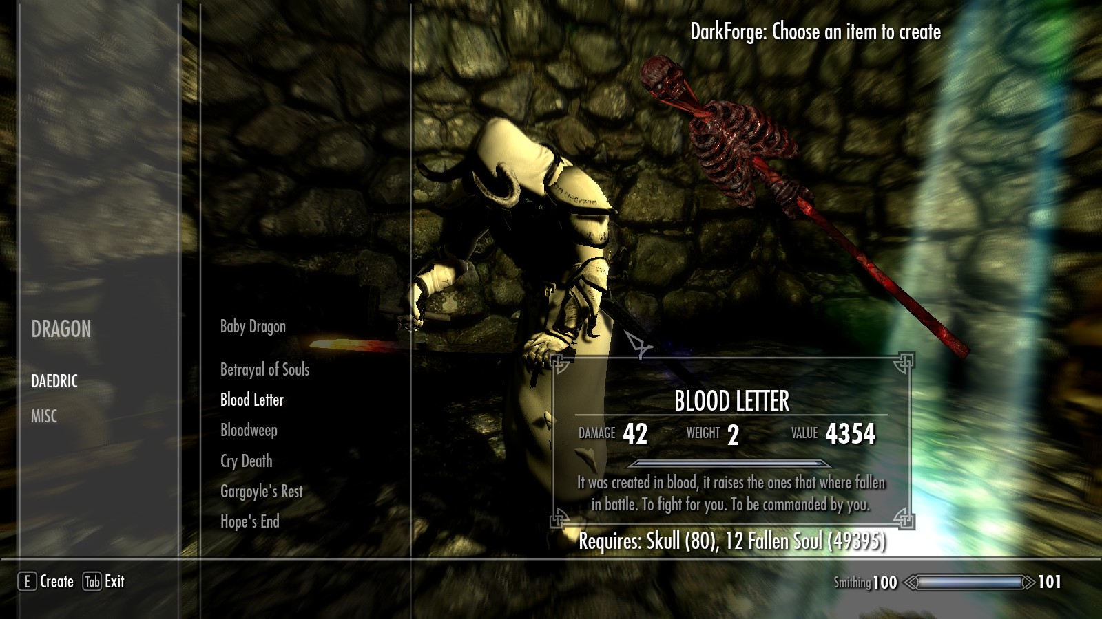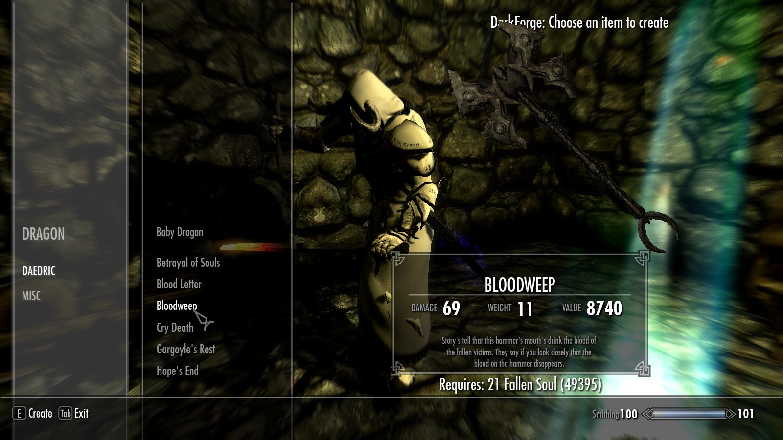 - Для создания предметов понадобятся павшие души.
