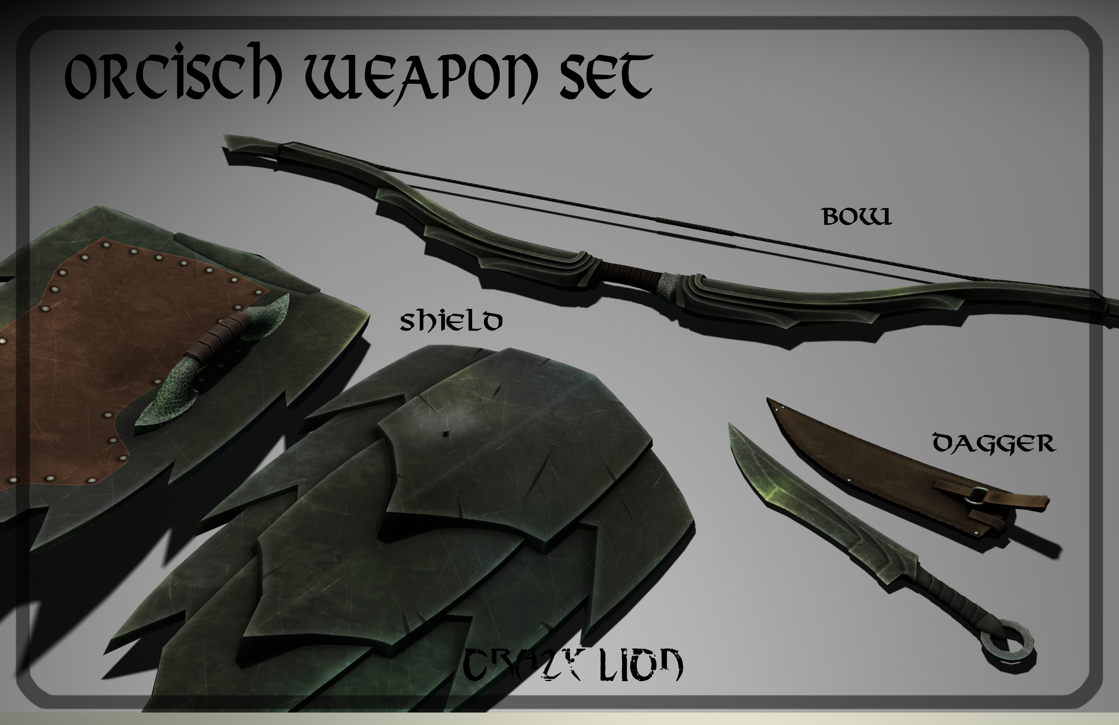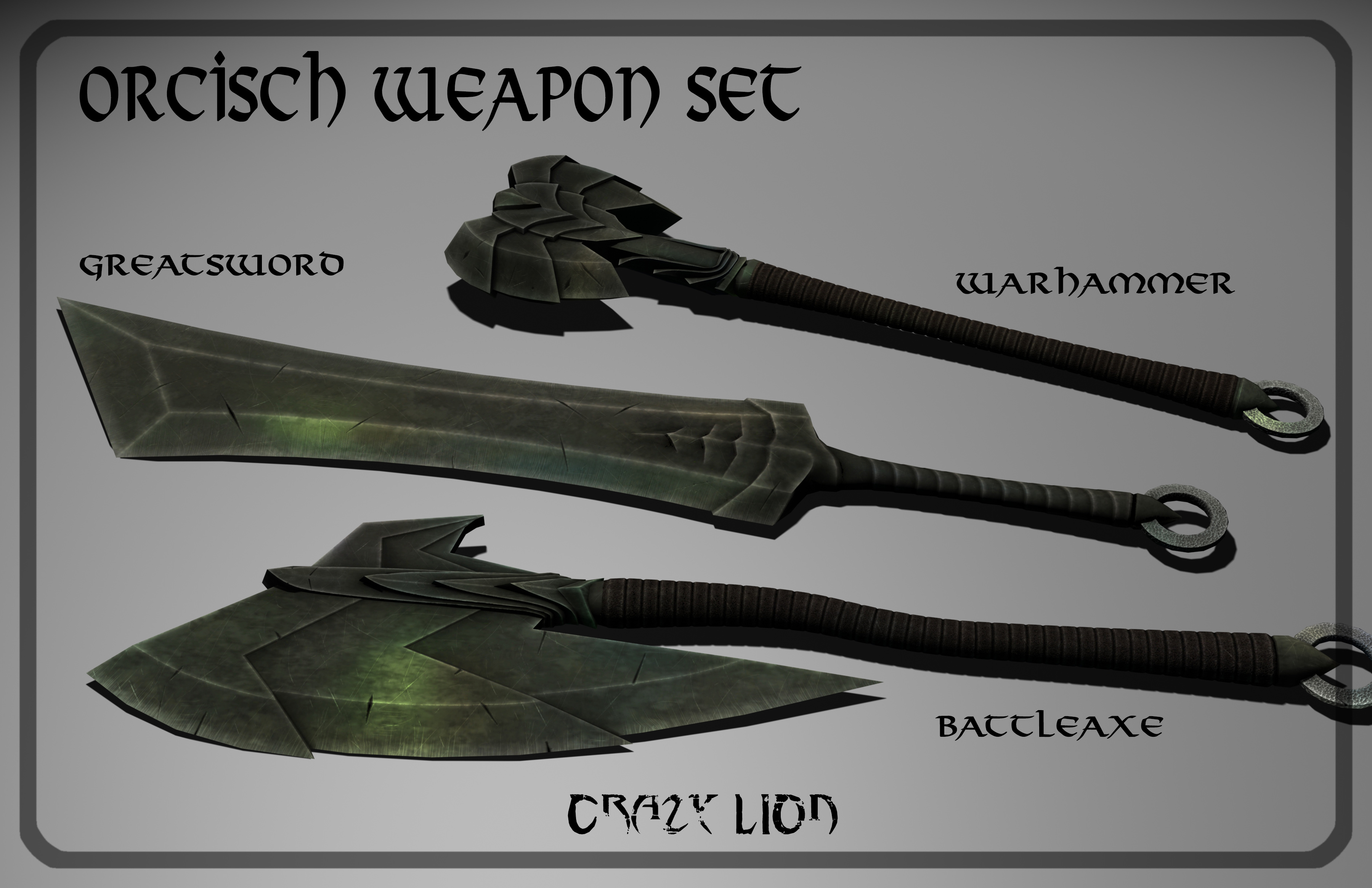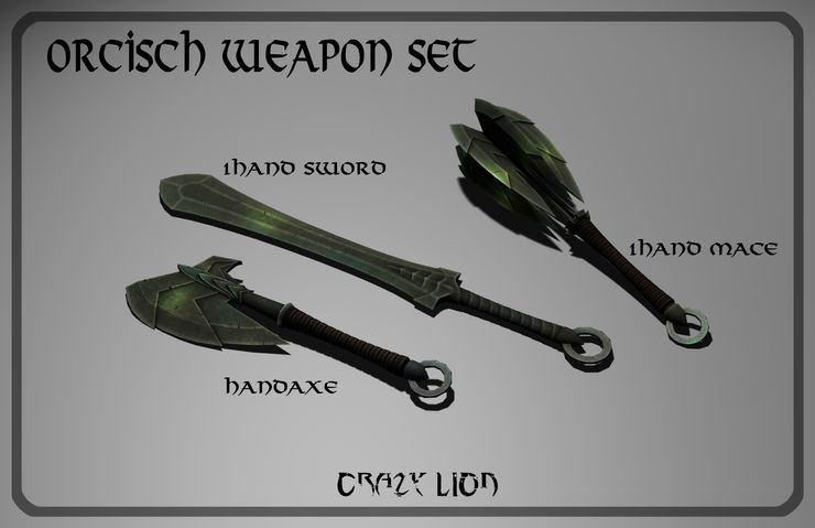 Этот мод добавляет новое орочье оружие или изменяет имеющееся (решать вам). В моде доступны: кинжал, меч, двуручный меч, секира, боевой топор, булава, щит, лук, боевой молот.
