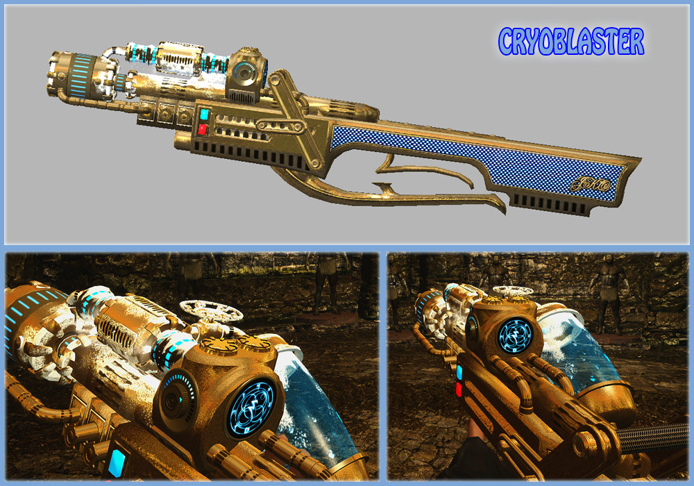 Этот мод добавляет три вида двемерских бластеров - Криобластер, Огнемет, Плазменная пушка. Каждый бластер имеет уникальный внешний вид, звуки и визуальные эффекты. Технически бластеры являются арбалетами, они могут использовать стандартные арбалетные болты. Но их реальная сила заключена в специальных патронах, которые различны для каждого оружия: