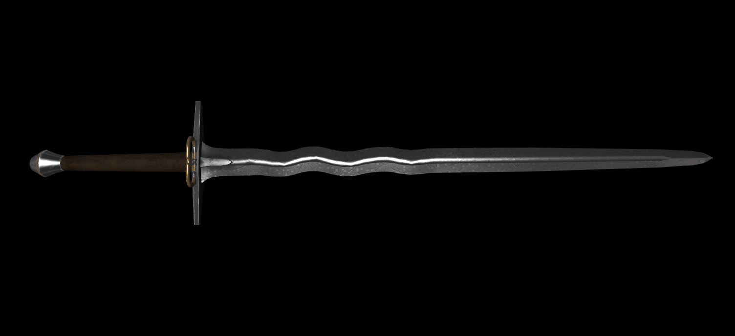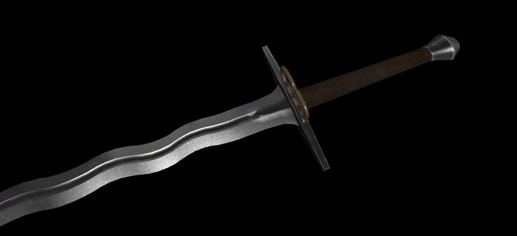 Изобретатель этого меча был гений, восторгался Тарасюк. После Первого крестового похода он задумал совместить мощь большого меча с режущим эффектом гнутой арабской сабли: рубить с потягом лучше гнутым клинком, тянешь к себе - и изгиб сам режет, принцип пилы. Но сабля стальной доспех не возьмет, а гнутый двуручные меч требует трехметрового роста, каковым не обладали даже лучшие из рыцарей: поэтому изгибов-дуг несколько - это меч-сабля-пила! Парируемый клинок врага легче задерживается в углублении изгиба и не скользит до гарды - улучшаются защитные качества, легче перейти к собственному поражающему выпаду. Зигзаообразность придает мечу пружинность в продольной оси - чем смягчается при парировании удар по рукам, облегчается защита в фехтовании. Наконец, та же пружинность сообщает удару концом клинка дополнительную силу: так удар кистеня, сделанного из свинцового шара на гибкой рукояти из китового уса, сильнее удара молотка того же веса и той же длины жесткой деревянной рукояти.