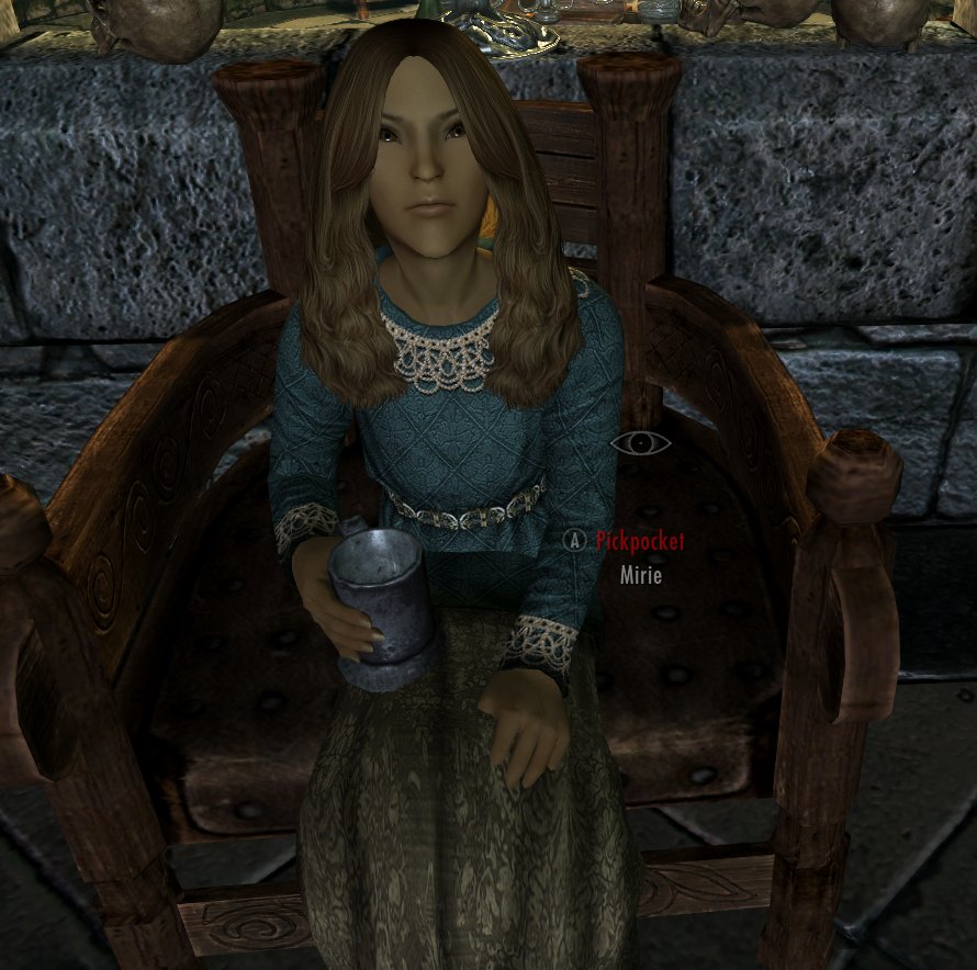 Мири - Арканеум, Коллегия Винтерхолда. Мири - вундеркинд, который узнал первое заклинание в возрасте четырех лет. Ее родители были бедными фермерами, которые вообще не знали, как использовать магию, поэтому отправили ее в Коллегию Винтерхолда. Мири была счастлива быть в окружении, где она могла учиться и расти, пока однажды не получила письмо ярла о смерти своих родителей от рук бандитов. Мири переживает горе по сей день, но мечтает о доме и семье.