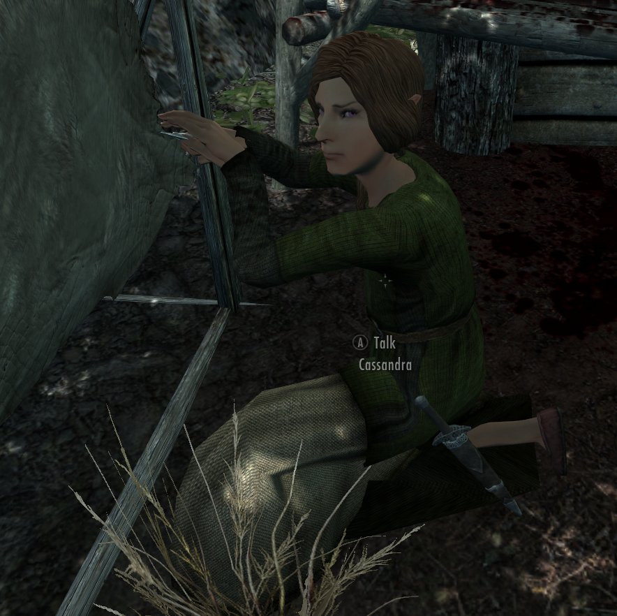 Кассандра - Охотничий привал, Фолкрит. Кассандра никогда не знала своих родителей. Ее удочерила молодая босмерка, которая входила в группу охотников, живших в охотничьем привале, недалеко от Полулунной лесопилки. Устав жить простой жизнью охотника, мать Кассандры присоединилась к группе бандитов в соседнем Форте. Кассандра в основном охраняет маленькую хижину, ожидая, когда ее приемная мать вернется домой.