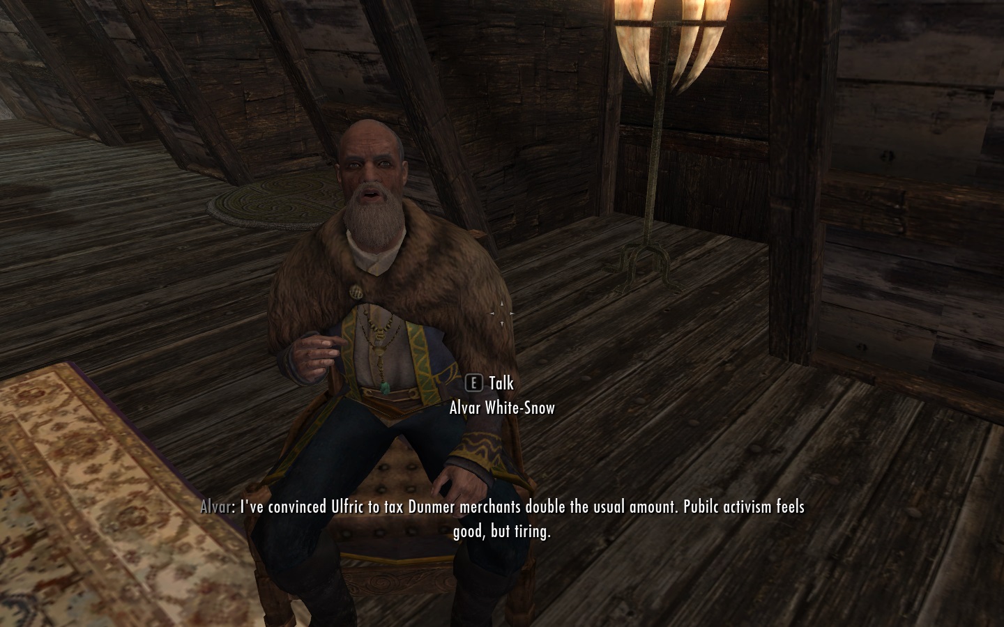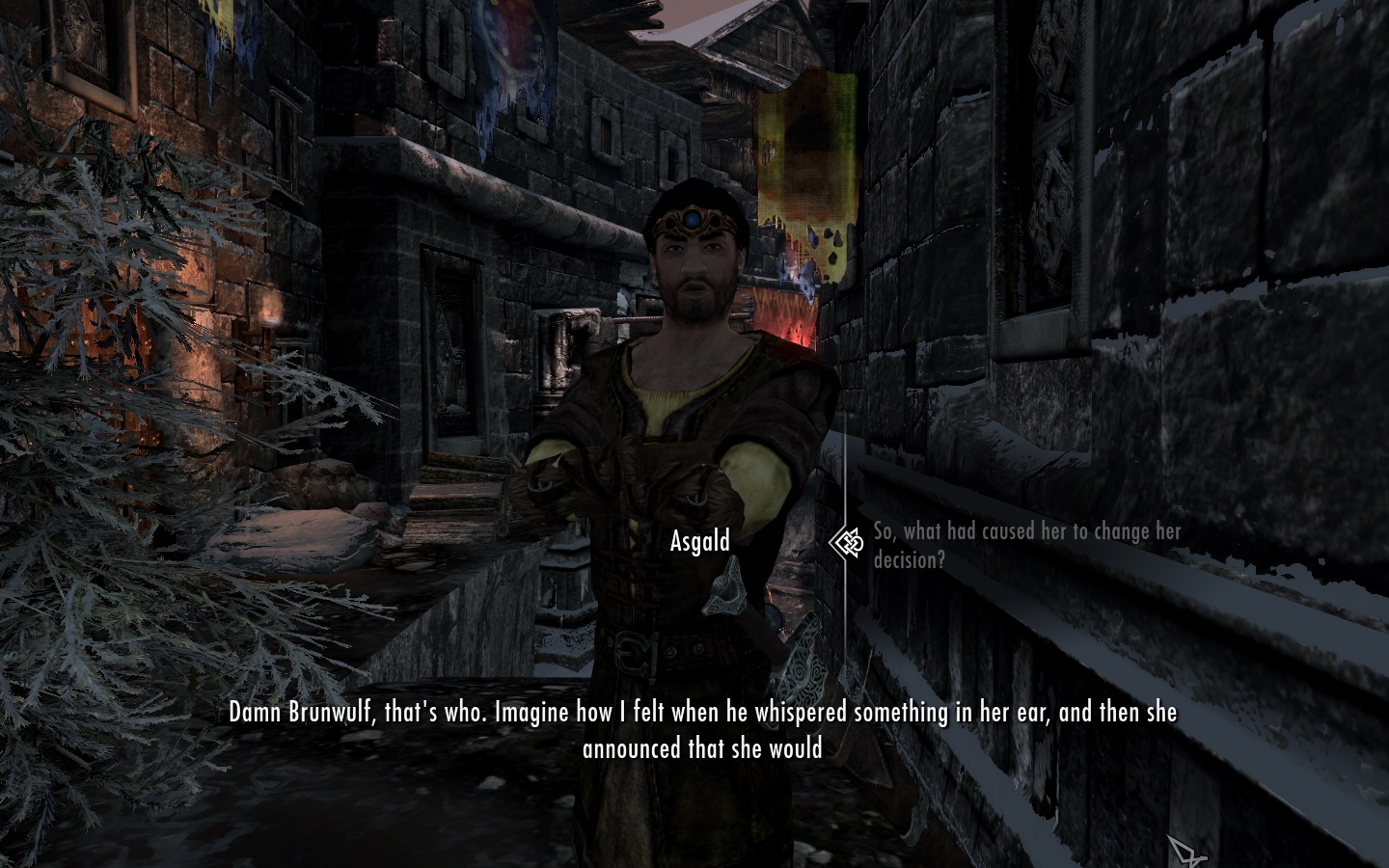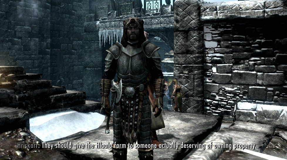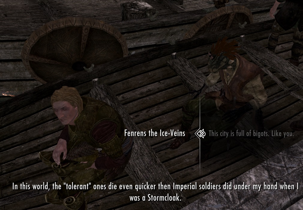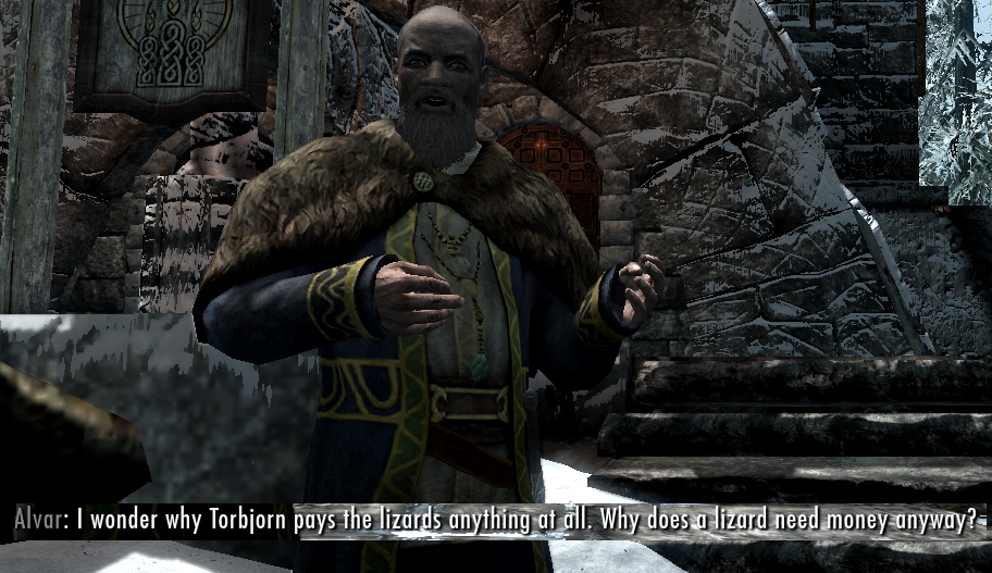 Также, теперь "толерантный" Бринвульф на самом деле толерантный. Он не будет городить отмазки по поводу того, почему аргонианам нельзя ходить по улицам Скайрима. И им можно будет, если Бринвульф станет ярлом.
