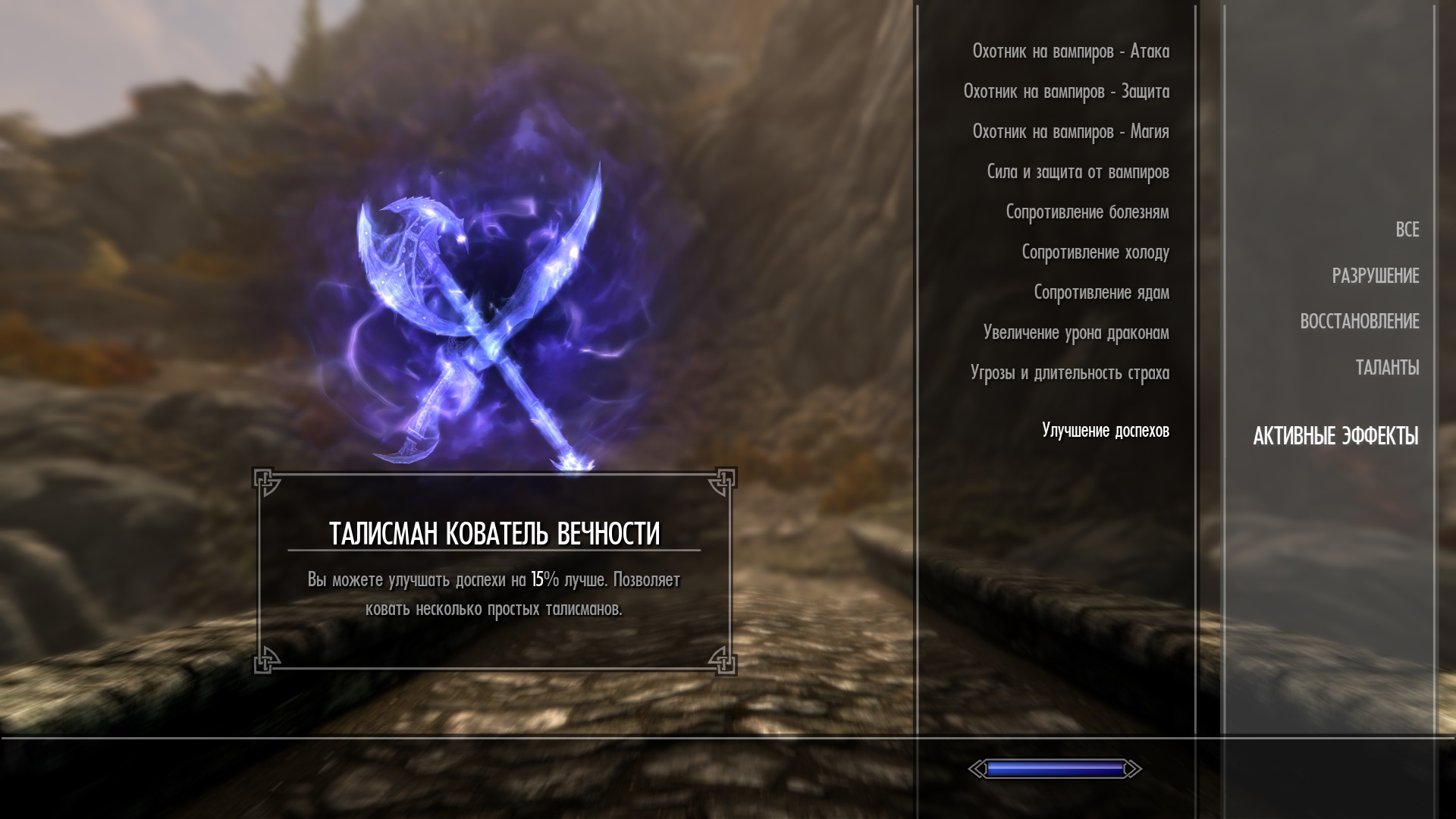 И особое внимание хочу уделить талисману Охотника на вампиров. Хоть я и являюсь поборником тёмной стороны, но странное отношение разрабов к Страже рассвета меня поставило в тупик. Для оборотней и вампиров-лордов они сделали аж новые деревья талантов, а для охотников на вампиров не придумали ничего. Кто-то может сказать, что в противовес им были даны квесты на поиски улучшений арбалетов и создание рунного снаряжения, но у Волкихарцев тоже есть квесты на поиски колец и остатков древних вампиров, так что эти квесты нивелируют друг друга, и стража остаётся ни с чем. Что же делает этот талисман? Изначально он даёт небольшие бонусы против вампиров, но с каждым пятым убитым вампиром у вас есть выбор, какой из показателей усилить. Каждый показатель можно усилить до 9 раз, сделав из 5% целых 50! Чтобы развить все показатели, придётся истребить аж целых 135 представителей. Не дерево талантов, конечно, но тоже развитие. Надеюсь, вам понравится.