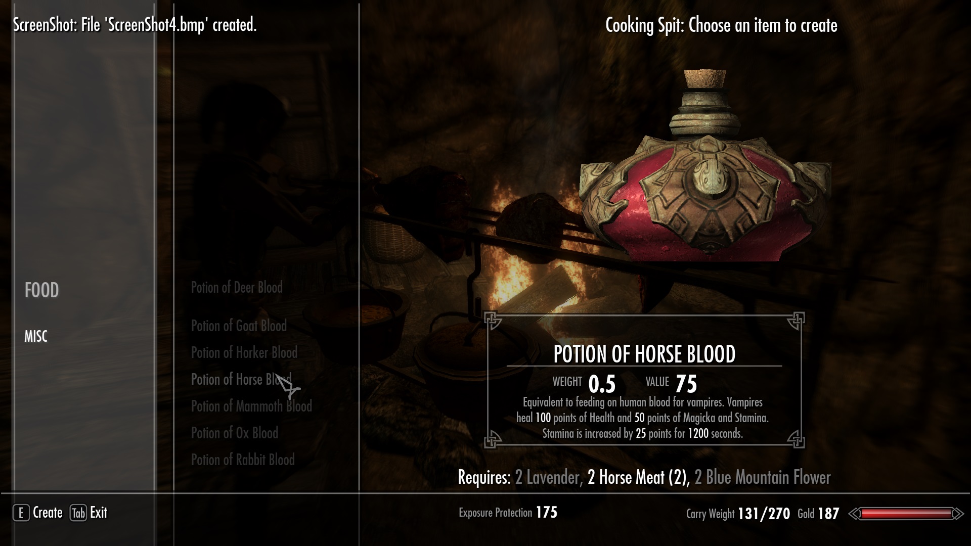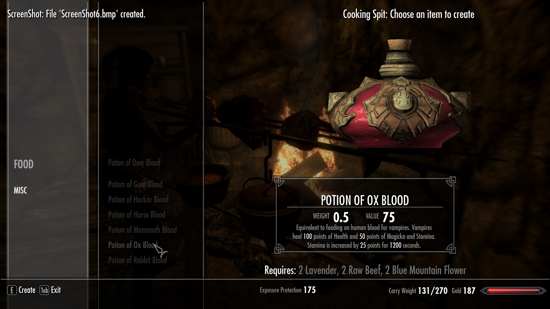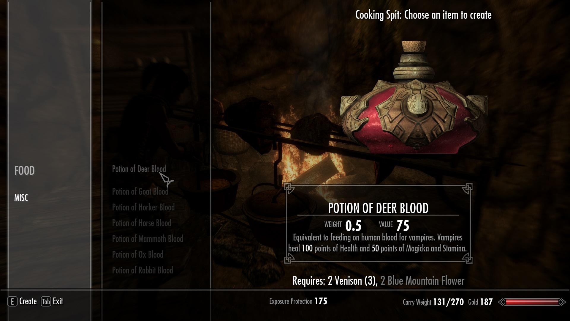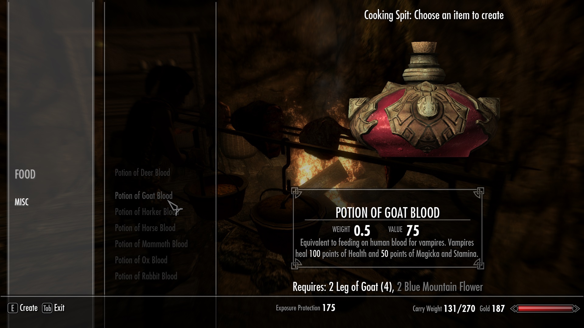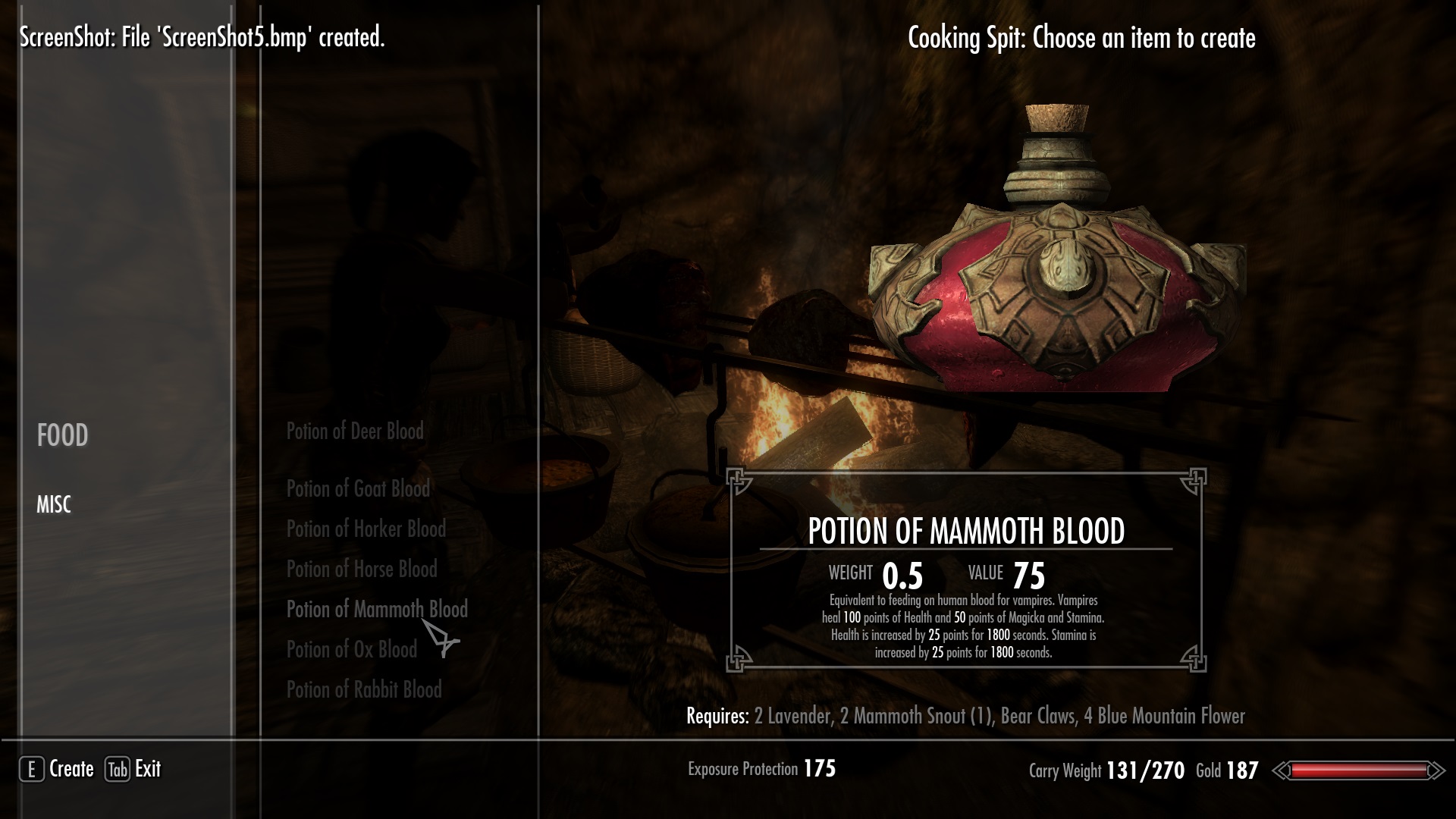 Этот мод добавляет в Скайрим 7 новых зелий из крови животных, которые вы сможете сделать из мяса животных и различных трав. Зелья имеют такой же эффект, как и зелье крови из Dawnguard + собственный. Зелья готовятся в котелке. Также в моде присутствует патч для Hunterborn.