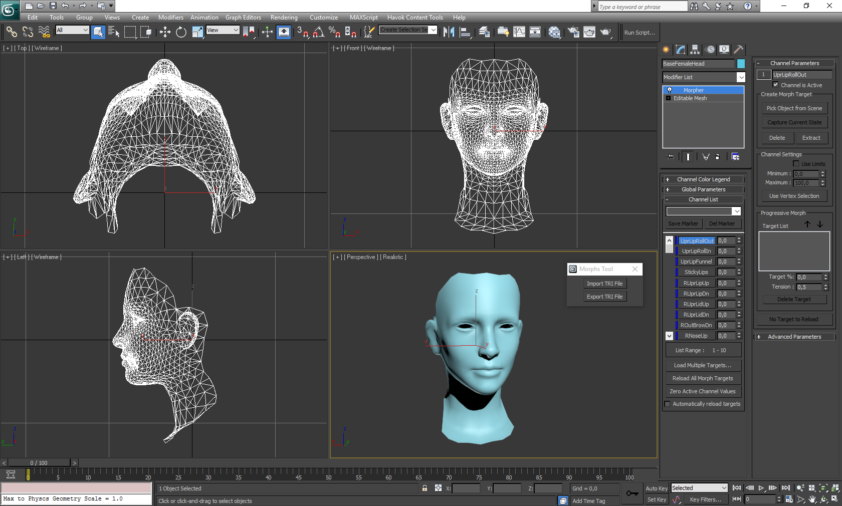 При импорте в сцене создаётся объект класса Editable Mesh базовой модели с одним или несколькими модификаторами Morpher. Этот модификатор поддерживает 100 каналов с морфами, поэтому при большем их количестве добавляется необходимое количество модификаторов.