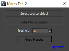 Для использования скрипта в сцене редактора 3ds Max необходимо иметь два объекта класса Editable Mesh. Первый с одним или несколькими модификаторами Morpher, который выбирается в качестве исходного объекта. Второй должен иметь одинаковую с первым геометрию, но при этом может иметь отличные от первого количество и нумерацию вершин, и выбирается в качестве целевого объекта. Если координаты вершин объектов незначительно различаются, то поправку можно скорректировать в поле Treshold. Значение надо подбирать по ситуации, при этом в случаях некорректных значений будет выведено сообщение о слишком малой либо большой величине. Нажатие кнопки Copy Morphs добавит необходимое количество модификаторов Morpher второму объекту, каналы с морфами которых будут соответствовать исходному объекту.
