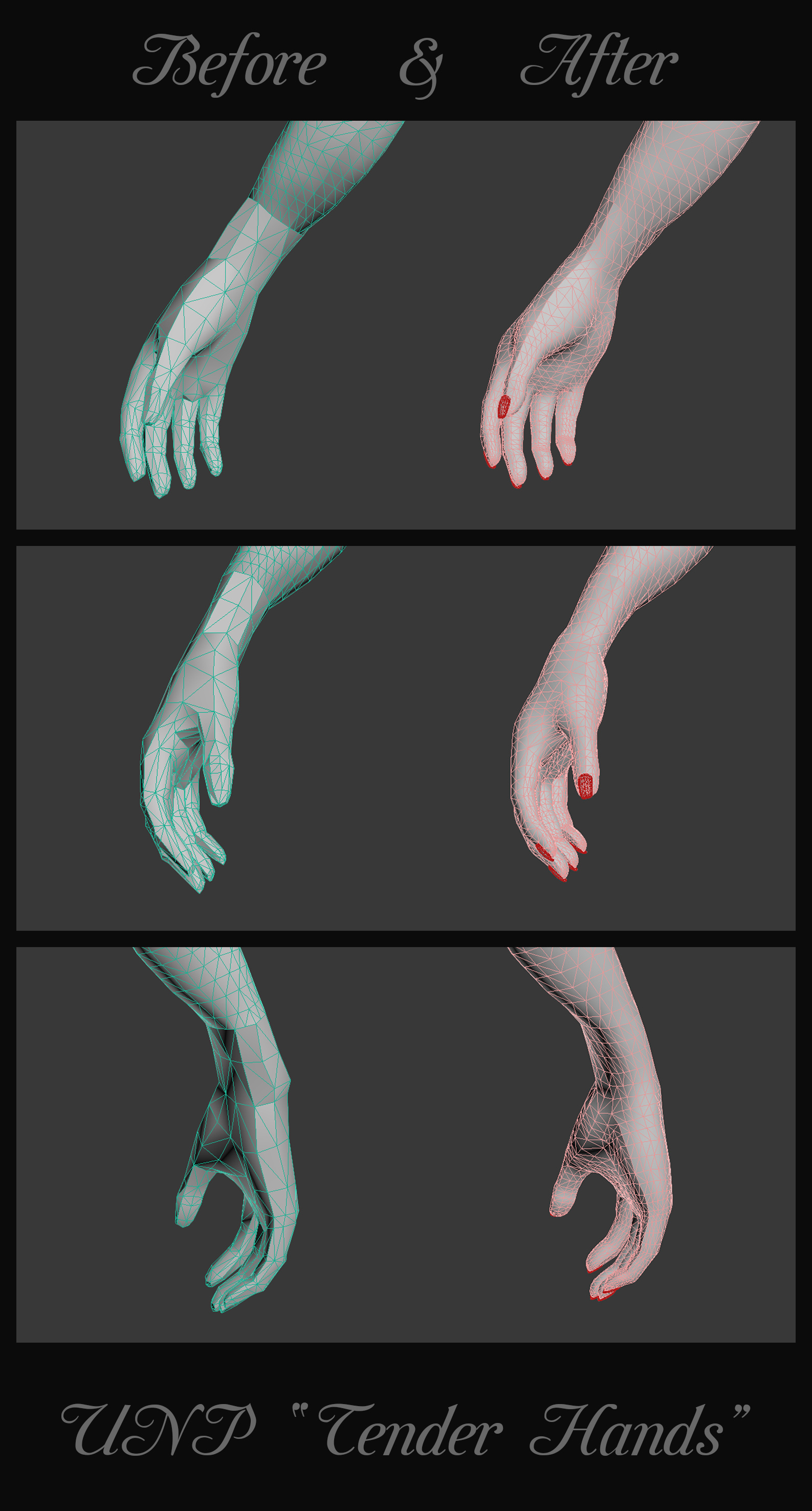 Была изменена топология и геометрия кистей. Теперь у моделей рук больше полигонов и более правильное анатомическое строение. Уменьшена ладонь, укорочены и заужены пальцы, изменено запястье (насколько это возможно). Я постаралась сохранить максимальную совместимость с ванильной разверткой рук, т.е. вы можете использовать любую текстуру, предназначенную для UNP.