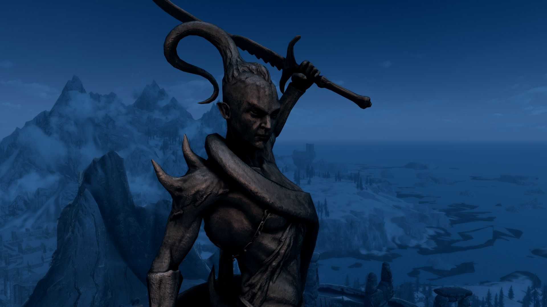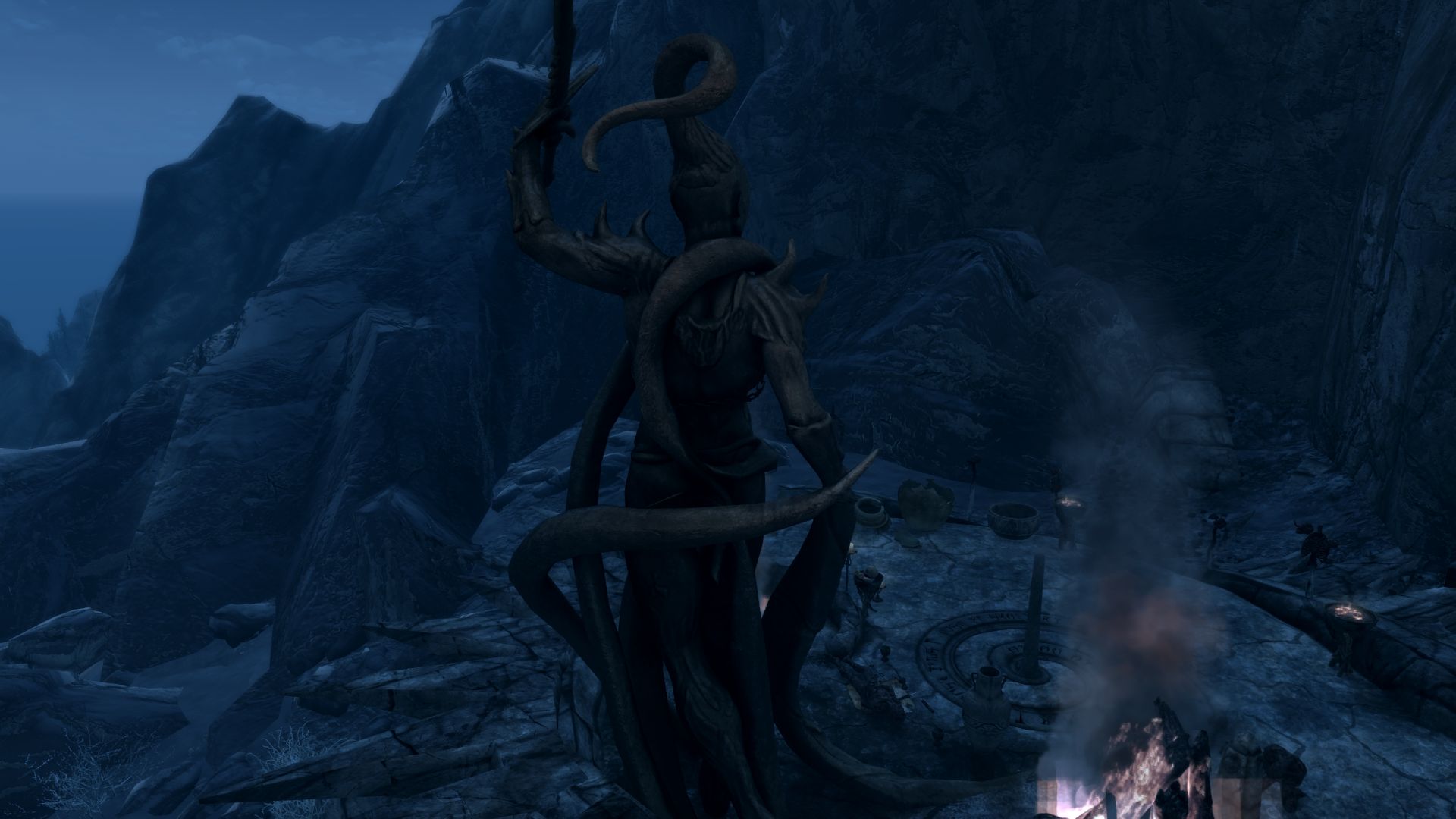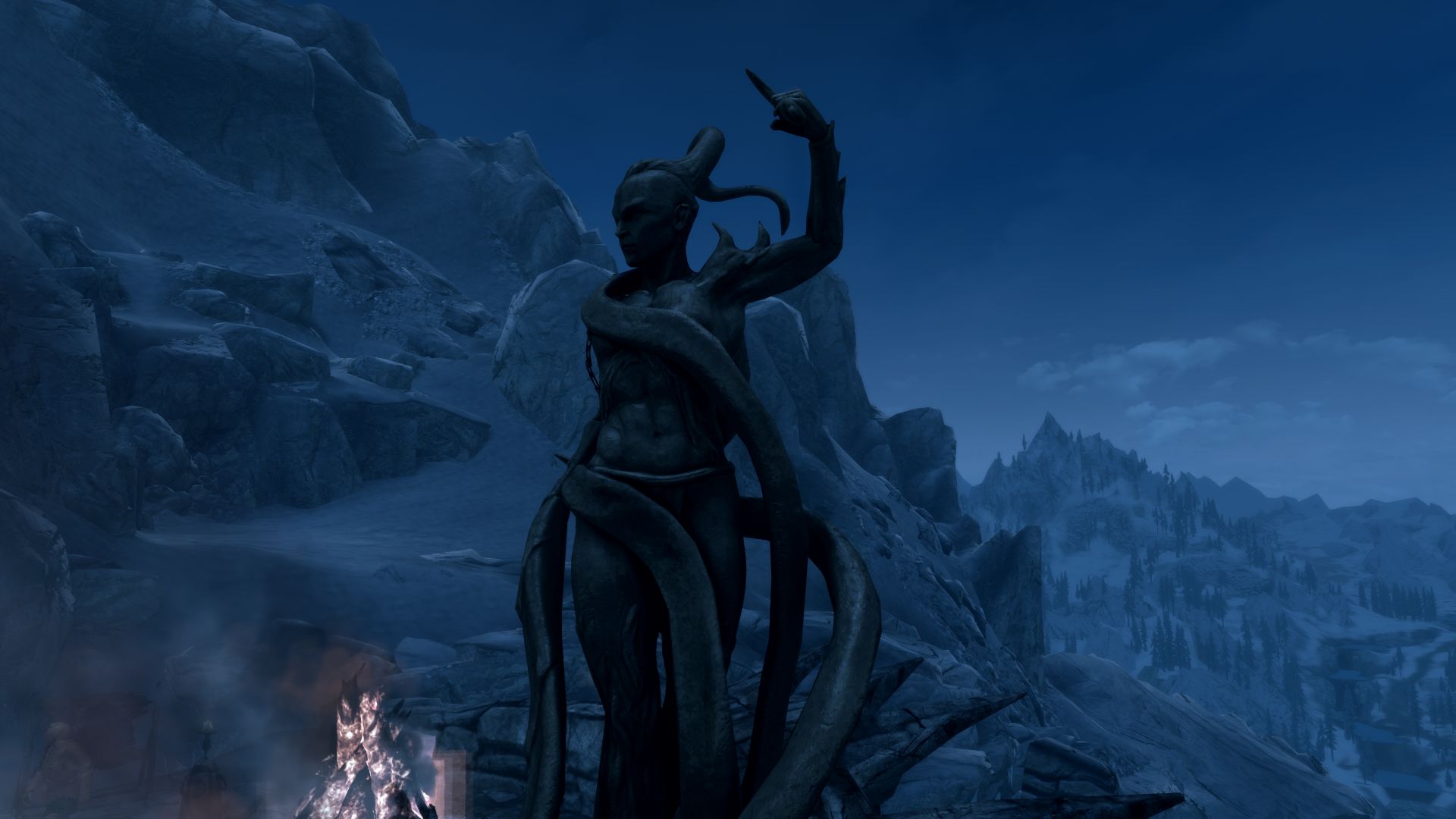 Это не похоже ни на Daggerfall, ни на Обливион. Щупалец там нет, одежда другая, обувь тоже другая, в том же Даггерфолле на лабутенах она была, прическа другая, меч другой и тп. Только то, что она выглядит как женоподобный мужик, не делает эту статую ориентированной на прошлые части)