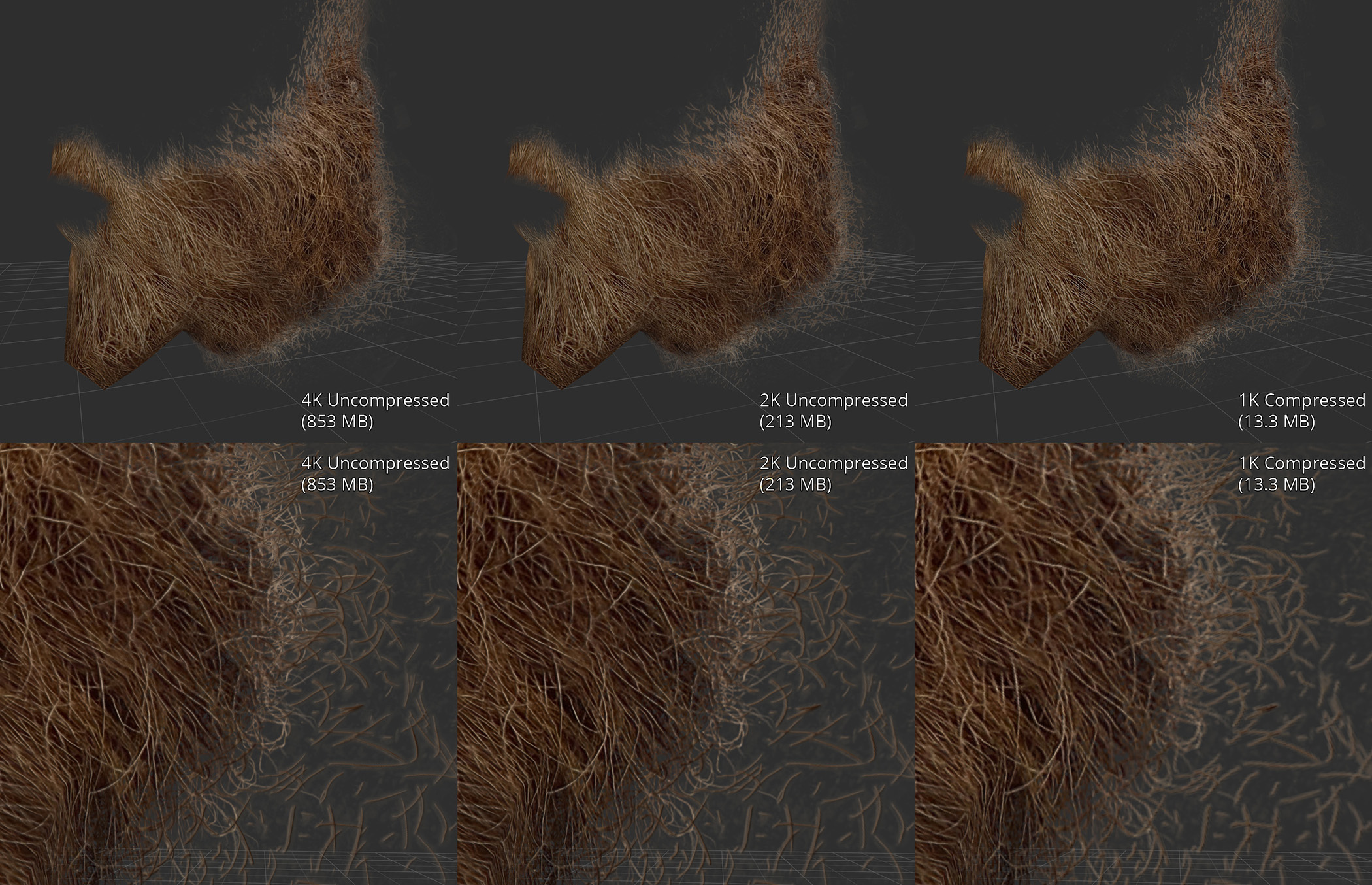 Разрешение текстур разнится от 512 пикселей (1024 для бород) до 2048 пикселей (4096 для бород), 2К (и 4К соответсвенно для бород), также имеются версии без сжатия (uncompressed).