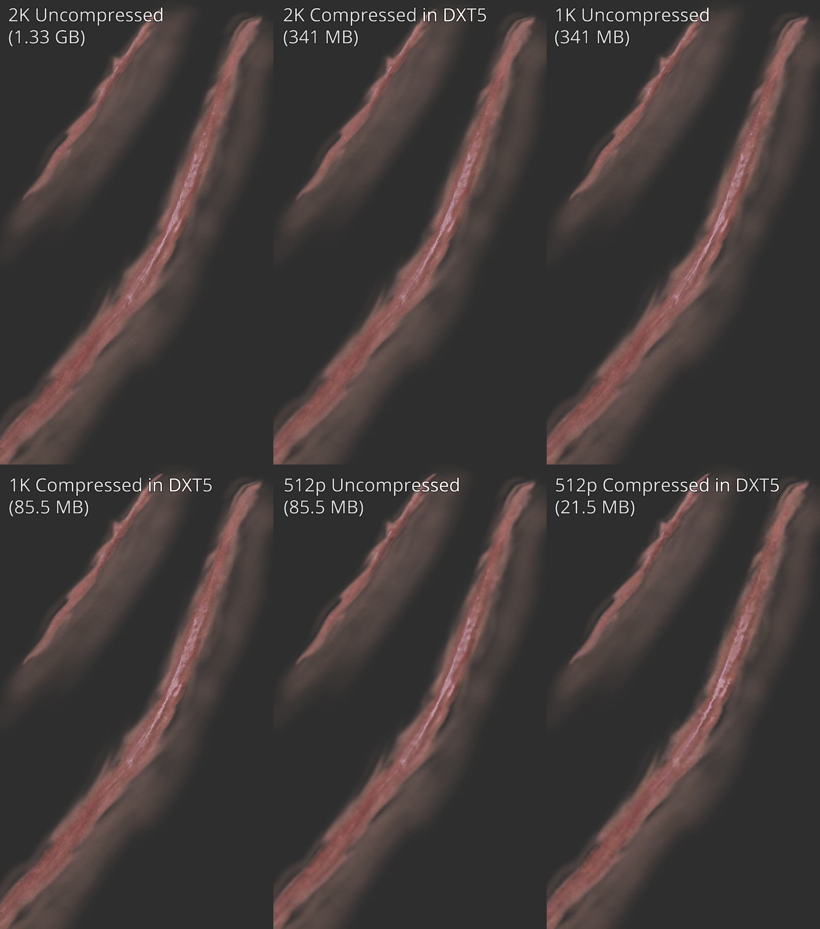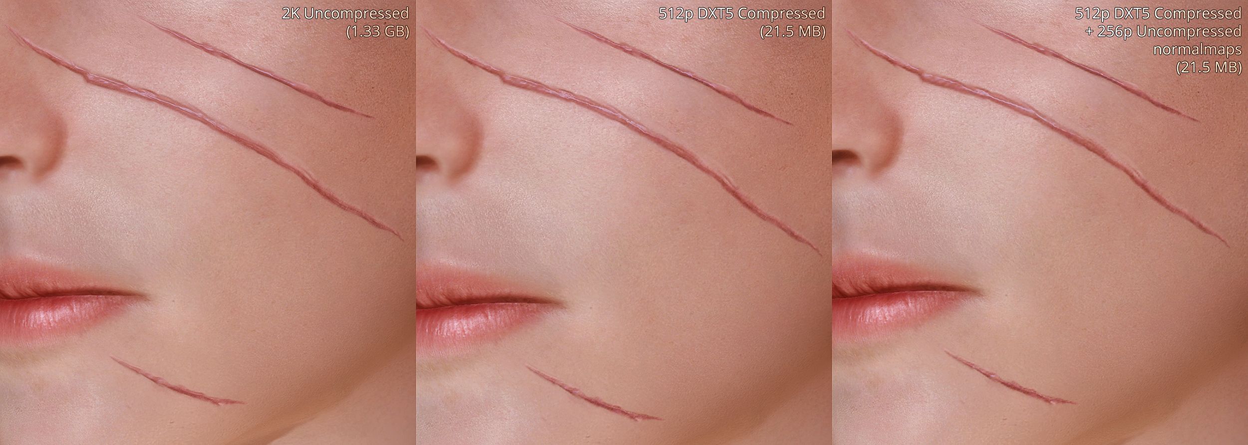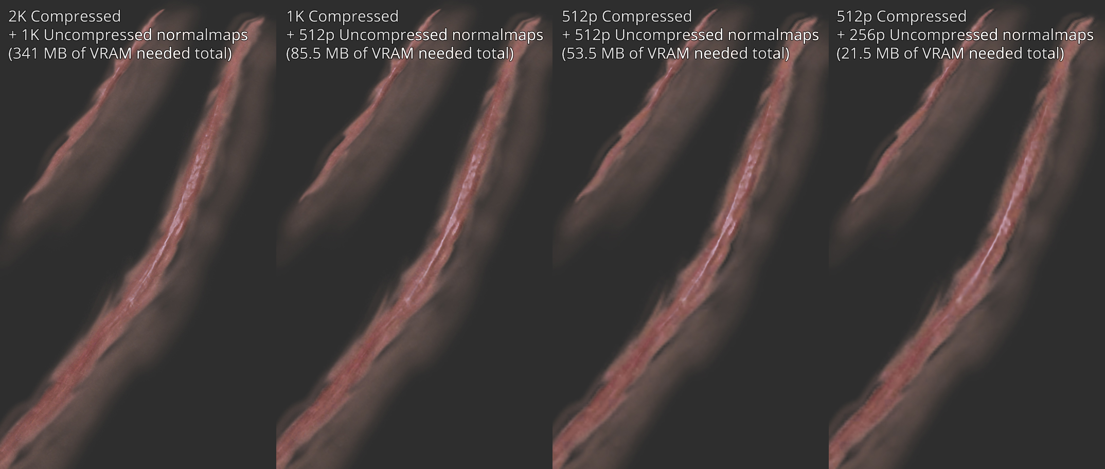Можете установить несжатые карты нормалей такого же или меньшего разрешения что и выбранный вами *сжатый* (DXT5) вариант текстур для сохранения видеопамяти и при этом лучшего качества.