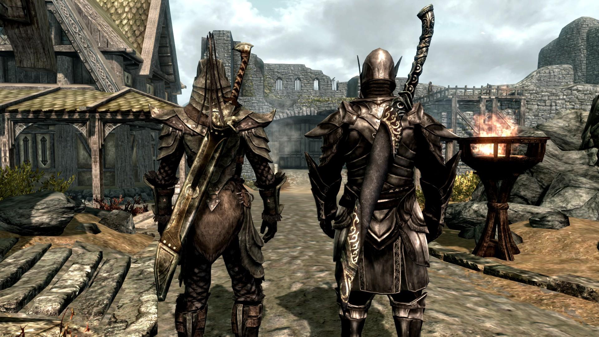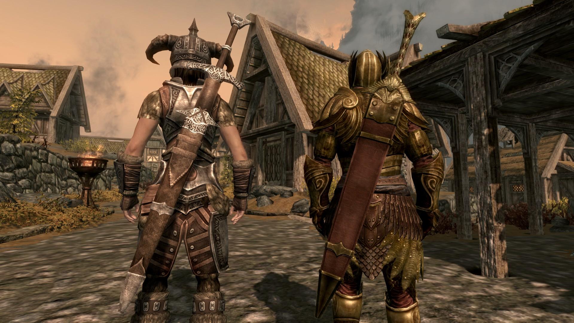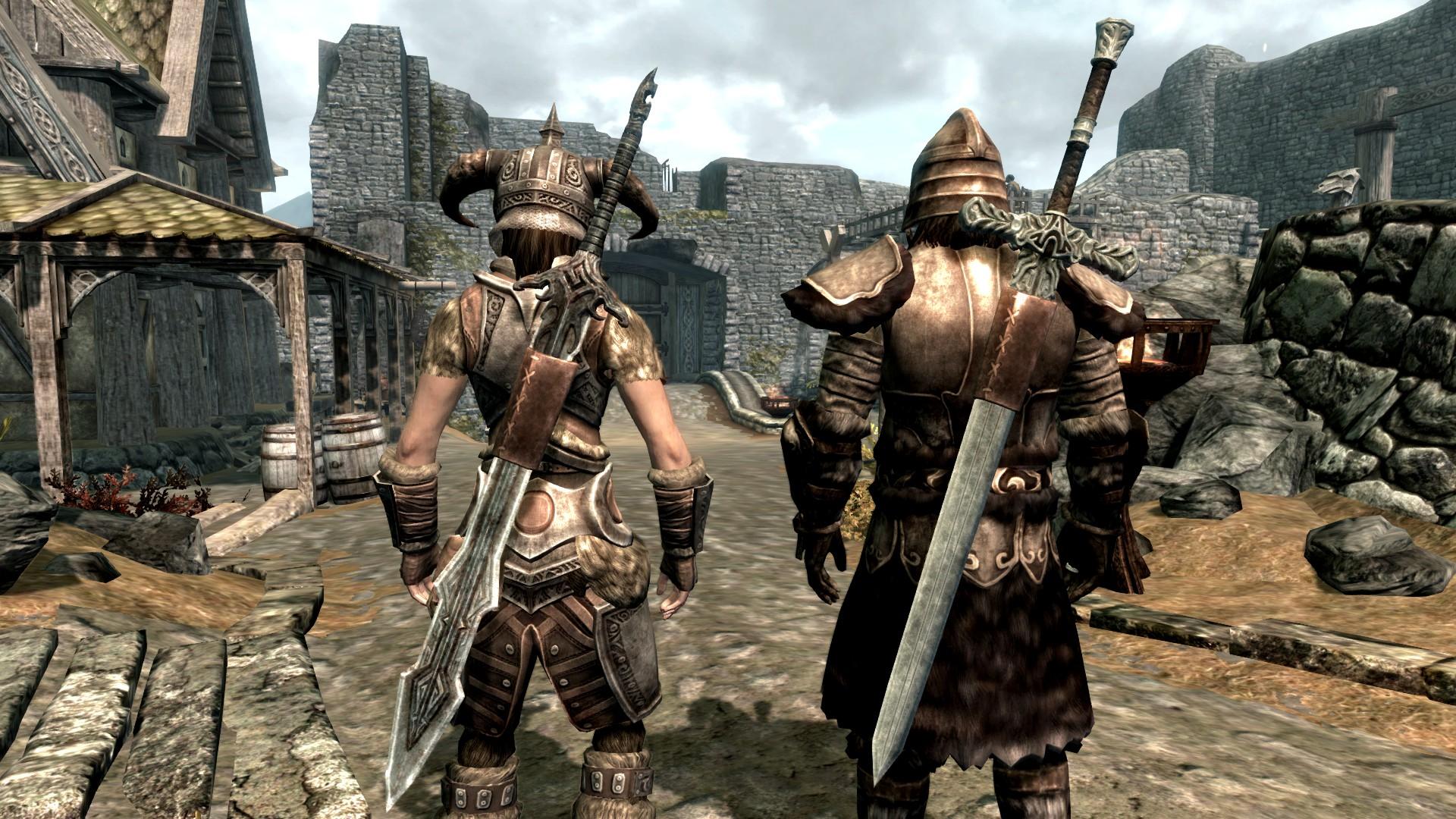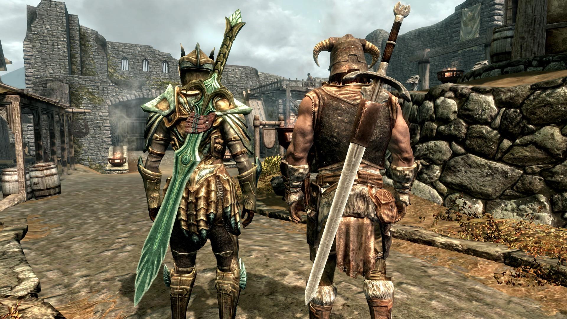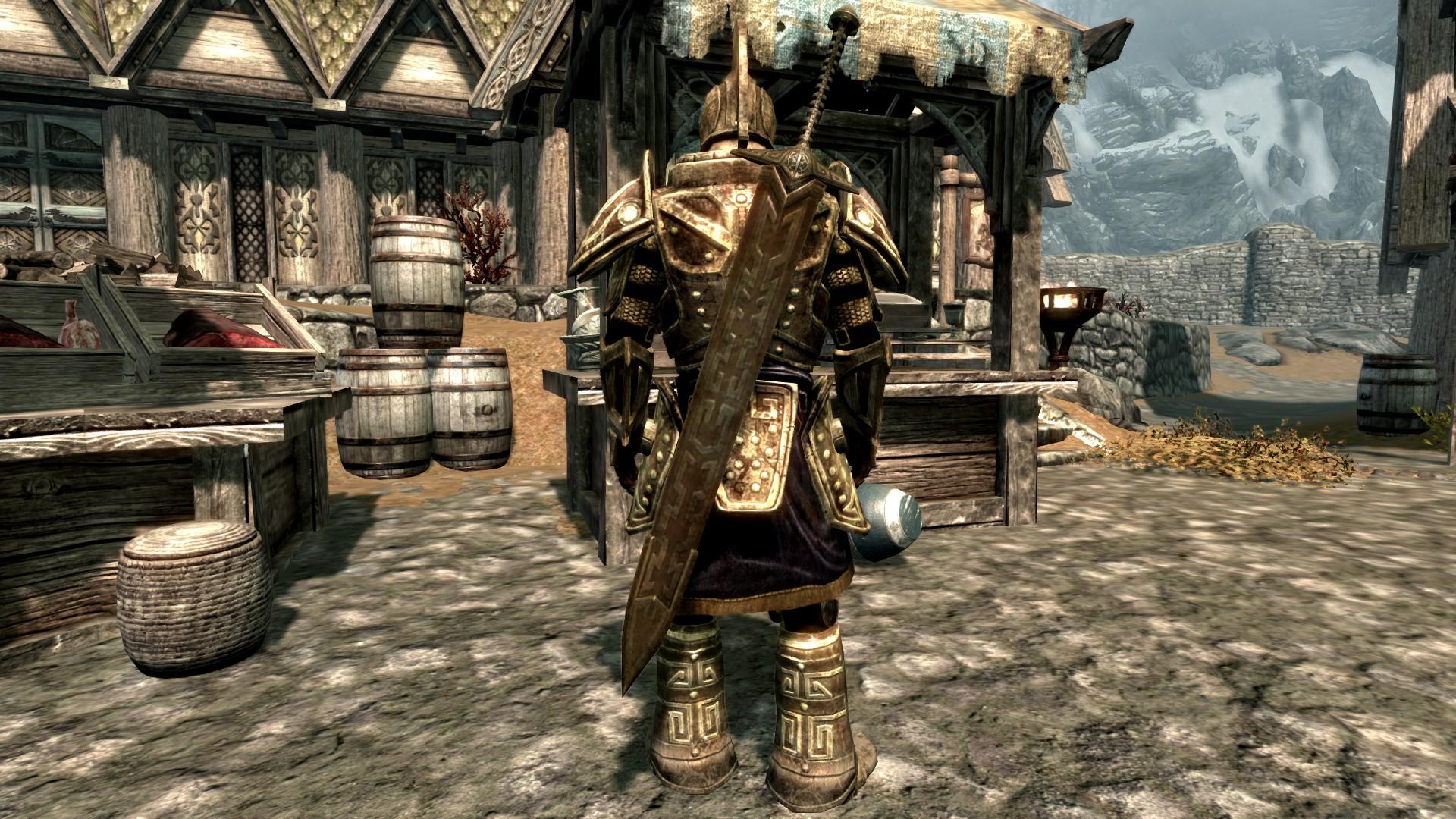 У двемерских, эбонитовых, оркских, эльфийских и стальных мечей ножны полные, а вот стеклянные, железные, серебряные, драугровские и нордские двуручные мечи удерживает на спине небольшой кусок кожи.