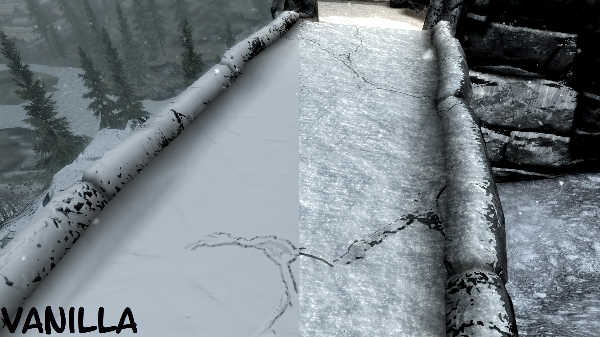 Мод изменяет скучную белую поверхность на настоящий снег. Около 1070 объектов используют динамический снег (который вовсе не динамический, а простой статический шейдер-эффект), и чаще всего снег выглядел некрасиво, словно окрашенная в белый цвет поверхность. Теперь же снег выглядит как настоящий!