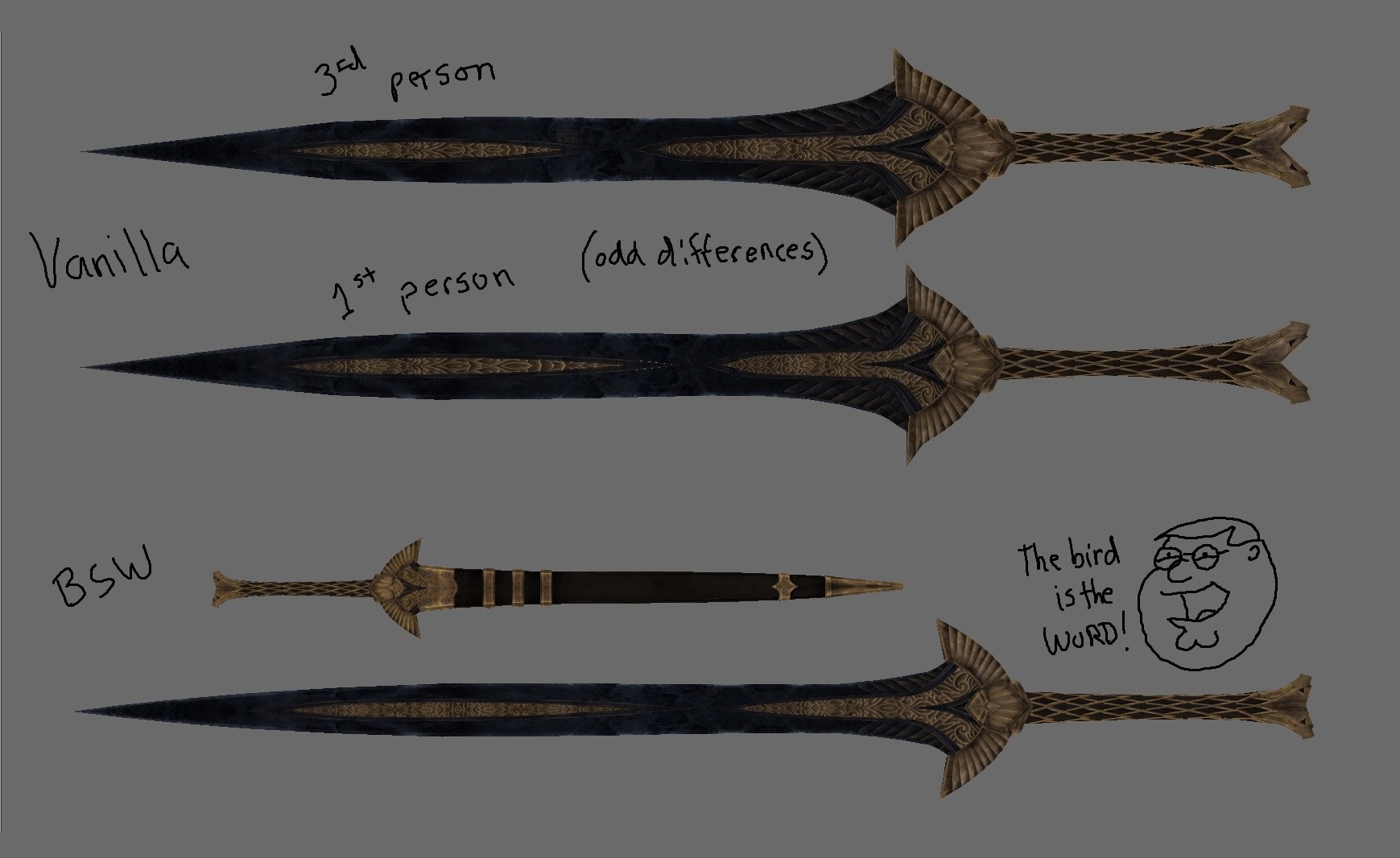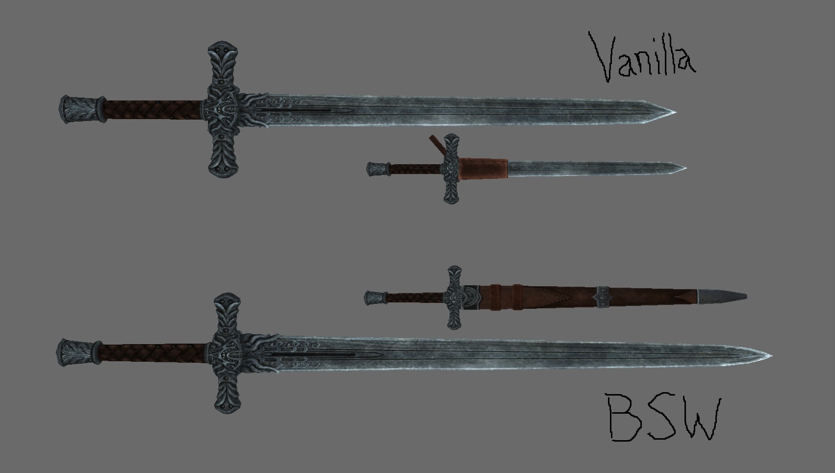 2## NGS (No Greatsword Sheaths) - удаляет ножны для двуручных мечей (в стиле оригинальной игры).