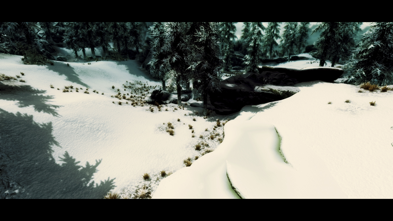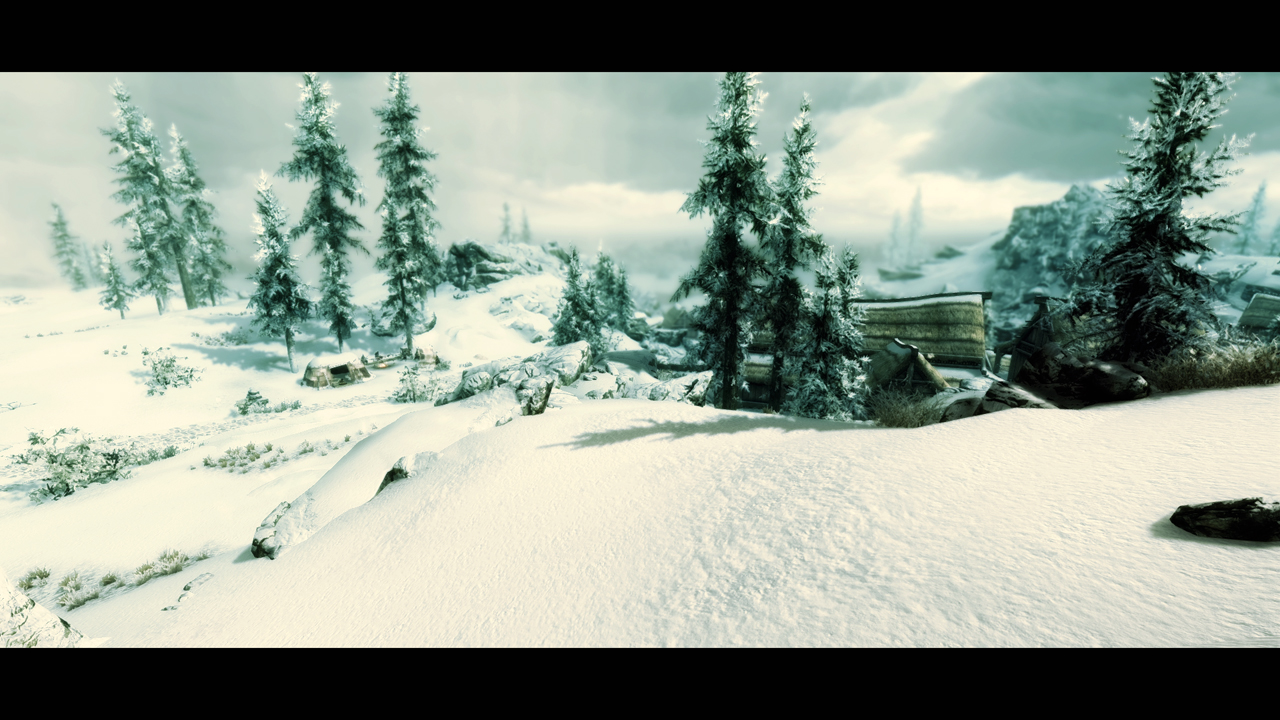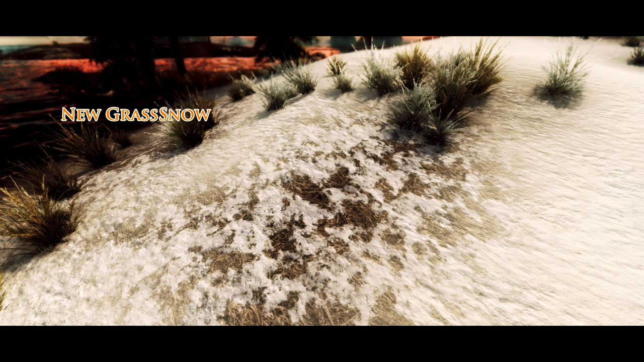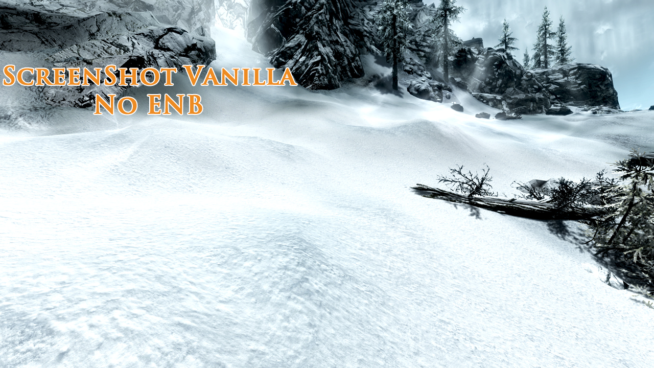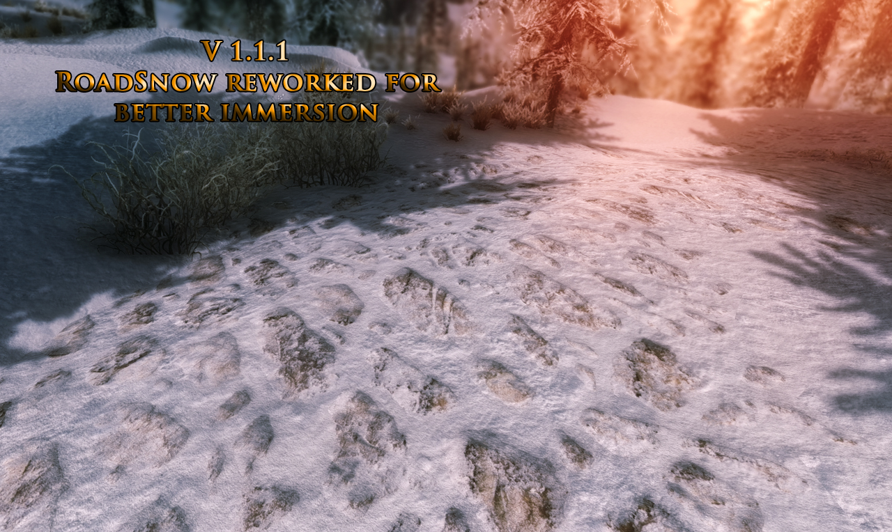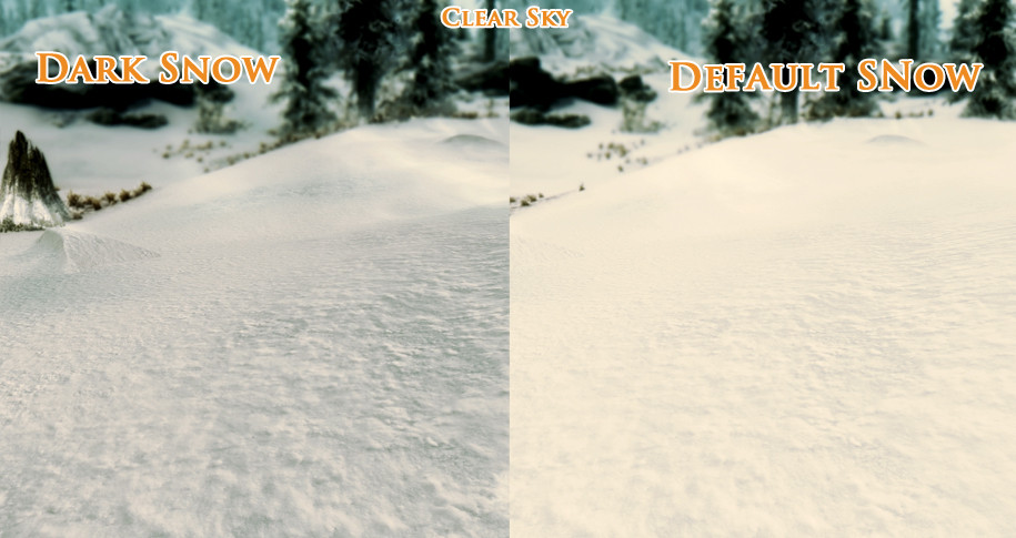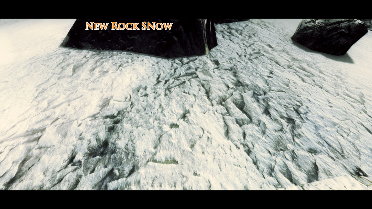 В холодном Скайриме поменяются текстуры припорошенной зимней крошкой дороги, жухлой старой травы, камней скал и конечно самого белоснежного ковра.