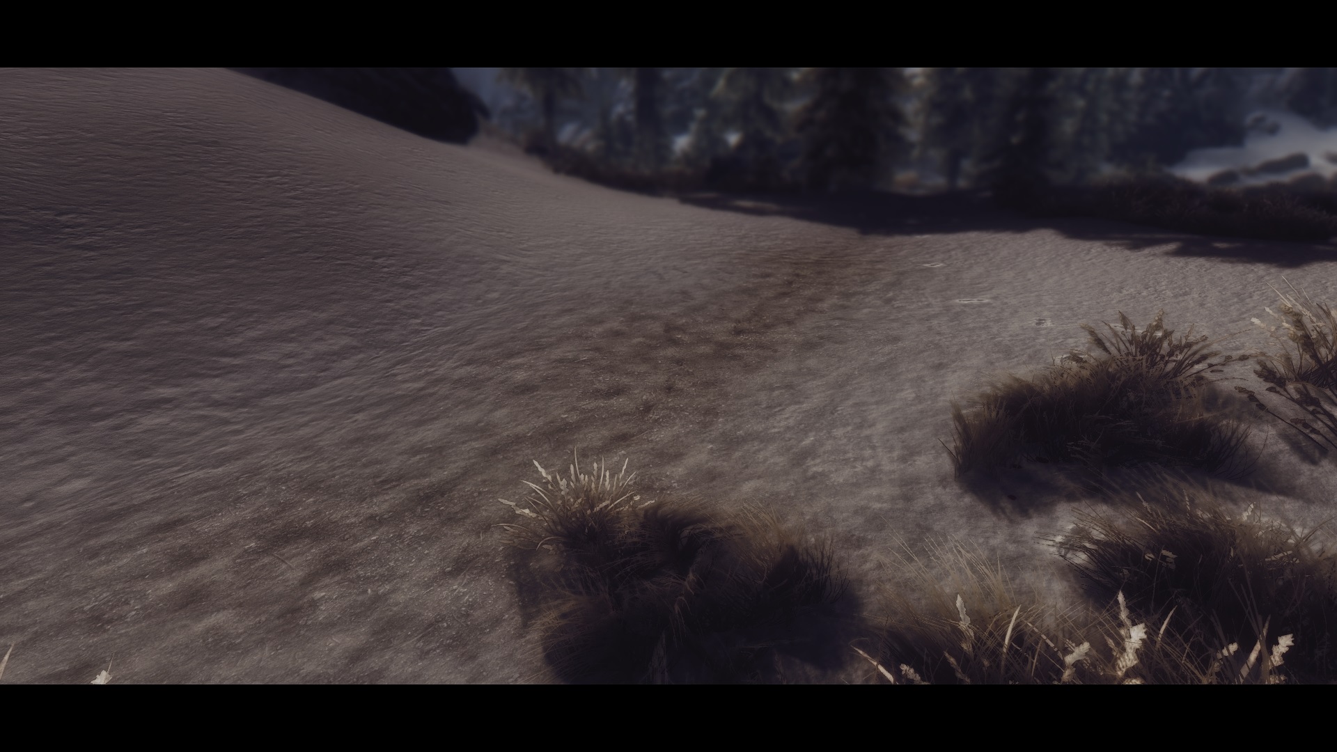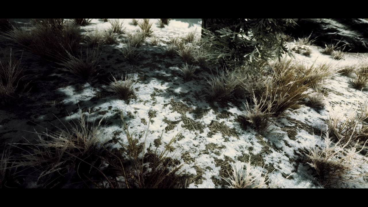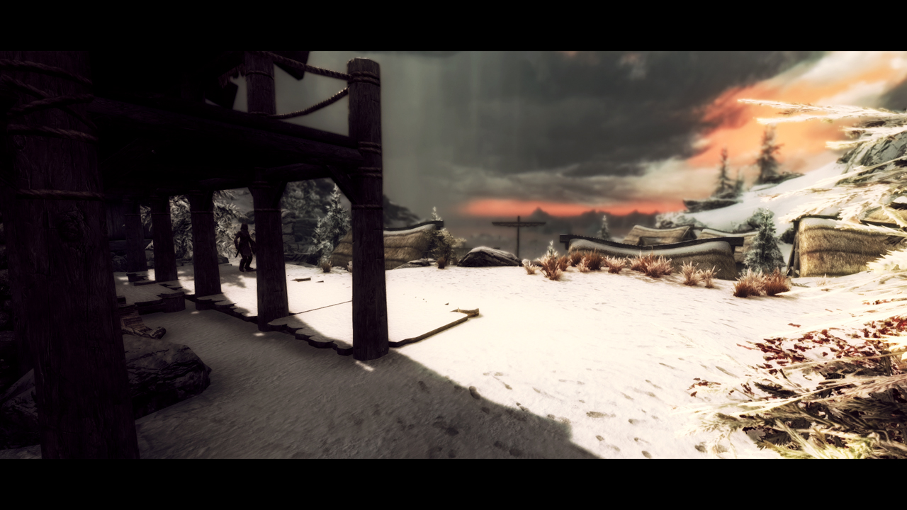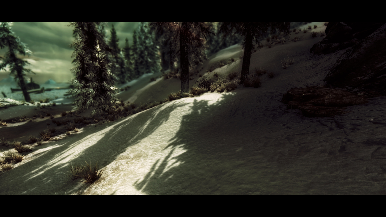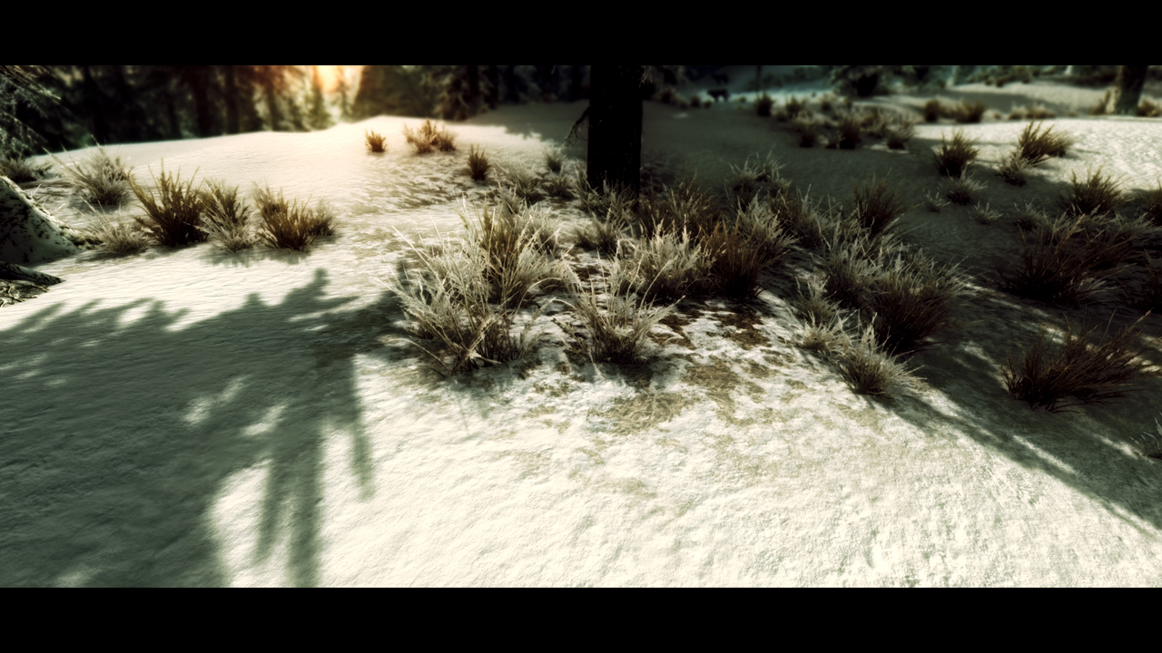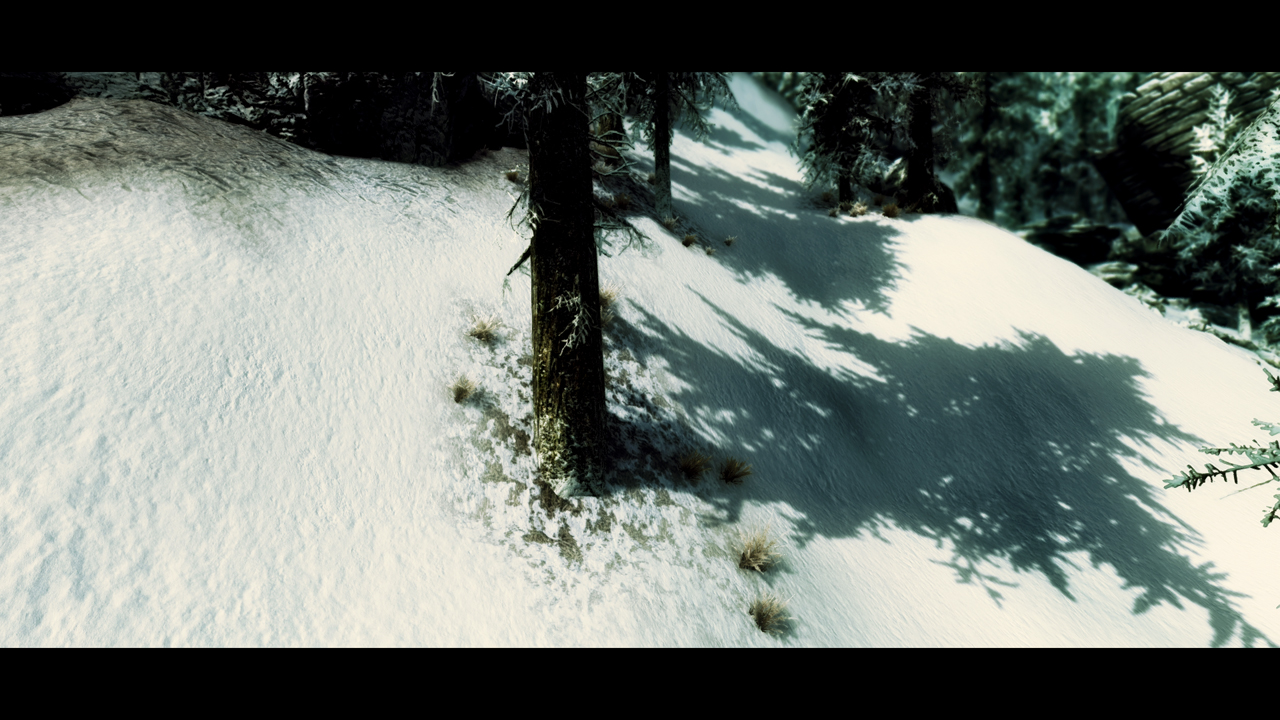 В холодном Скайриме поменяются текстуры припорошенной зимней крошкой дороги, жухлой старой травы, камней скал и конечно самого белоснежного ковра.