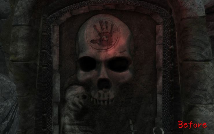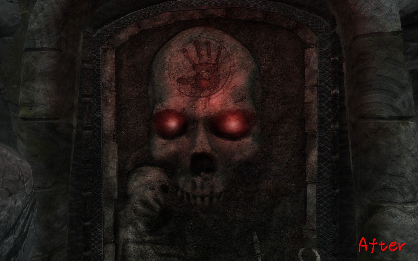 Качественно выполненный ретекстур двери, ведущей в убежище Тёмного Братства, в высоком разрешении 2048х2048. Версия "No Glowing Eyes" - без светящихся глаз.