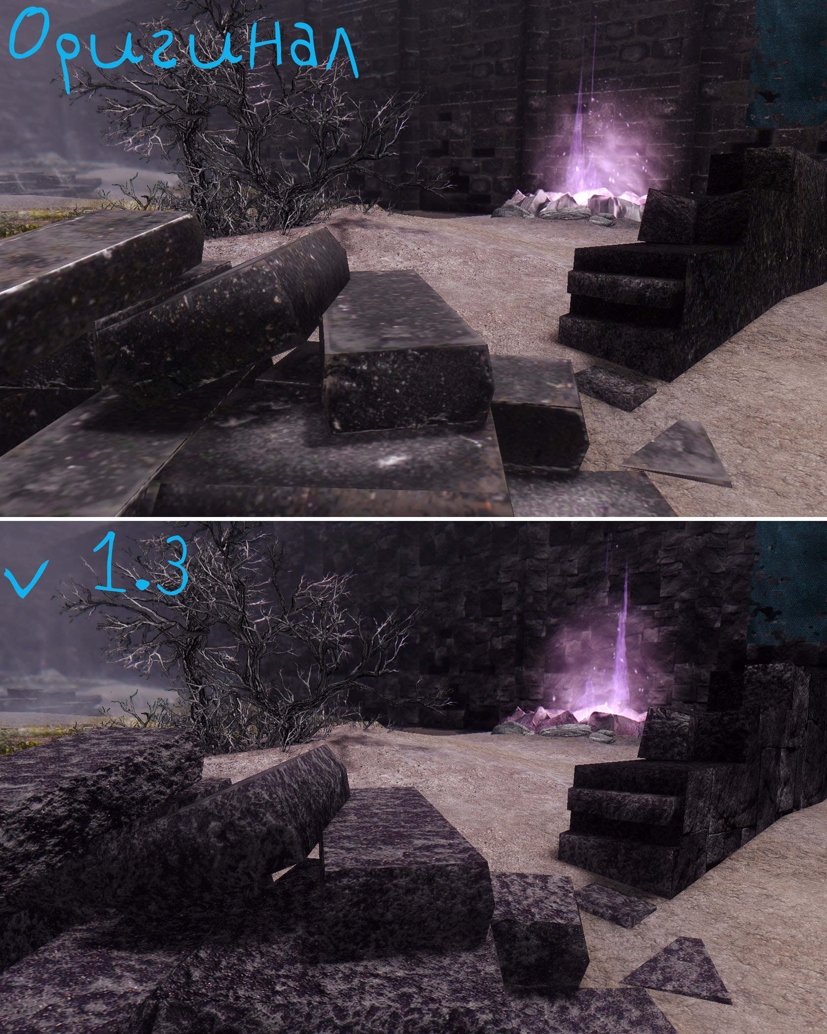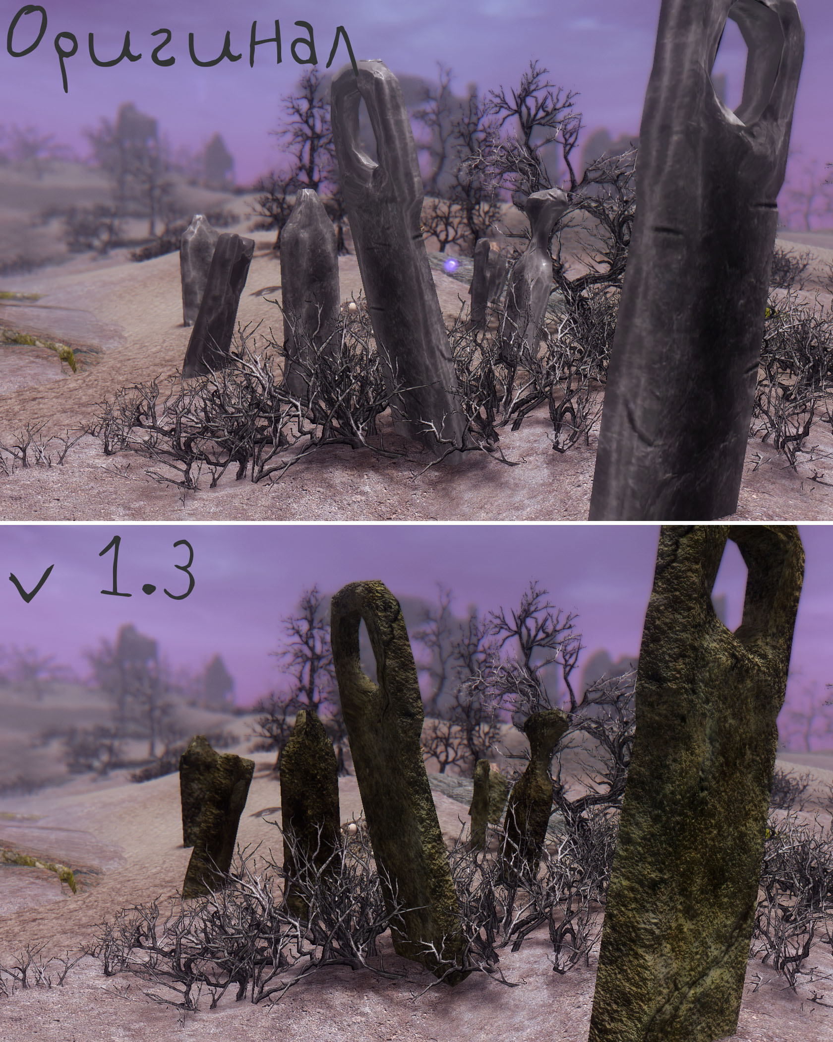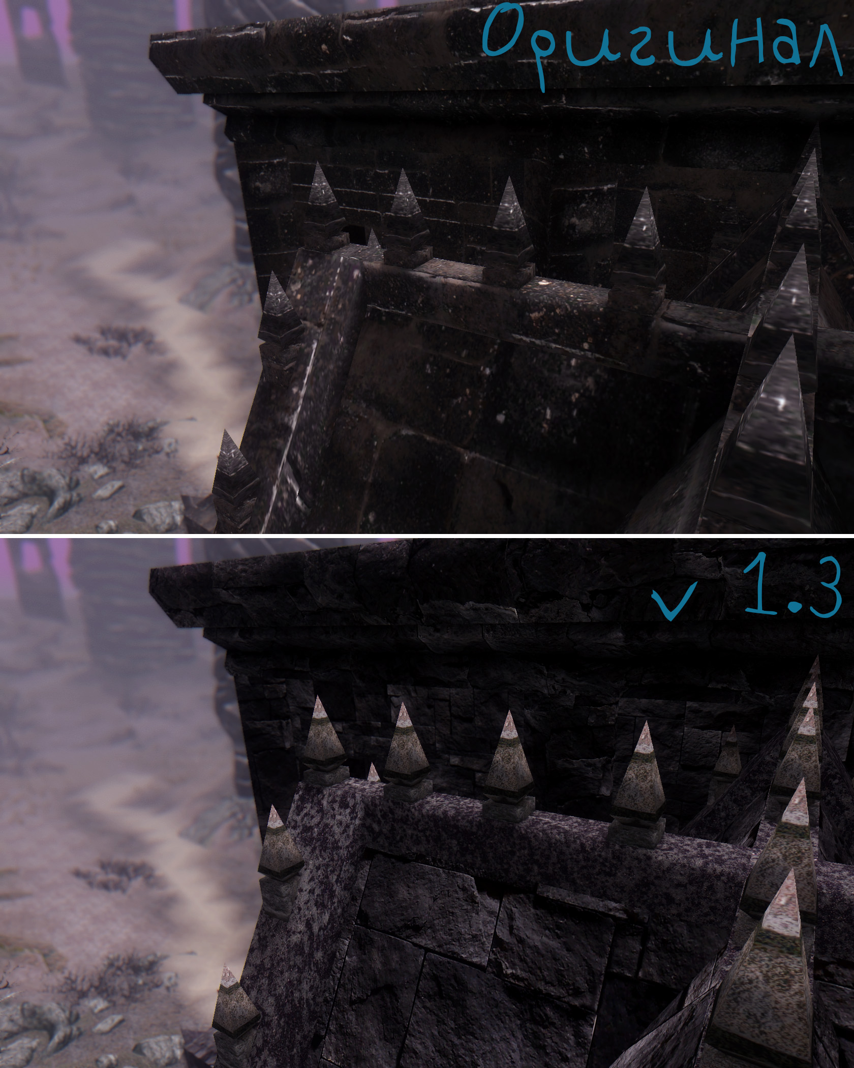 Каирн Душ, еще один план Обливиона, где бродят неупокоенные черные души Нирна, наводит ужас на всех, кто попал туда. Но к сожалению, оказавшись там, я ужаснулся не от зловещих душ или забытых, мрачных башен, а от всех тех же корявых текстур. Пришлось разбивать почти все меши на части чтобы внести хоть какое то разнообразие в монотонные строения. (можно было бы загрузить все в одну текстурку и повозиться с UV маппингом но как по мне, так это еще тот геморрой) Текстуры вышли размером 2048. Тем, кто играет без ENB или кому не нравится эффект параллакса - удалите все файлы с приставкой _P в папке Textures\dlc01\soulcairn