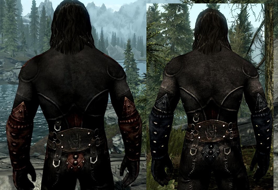 Ретекстур-реколор доспехов тёмного братства с разрешением 2048 и уменьшенным числом ярких вставок. Сравнение см. на скриншотах.
