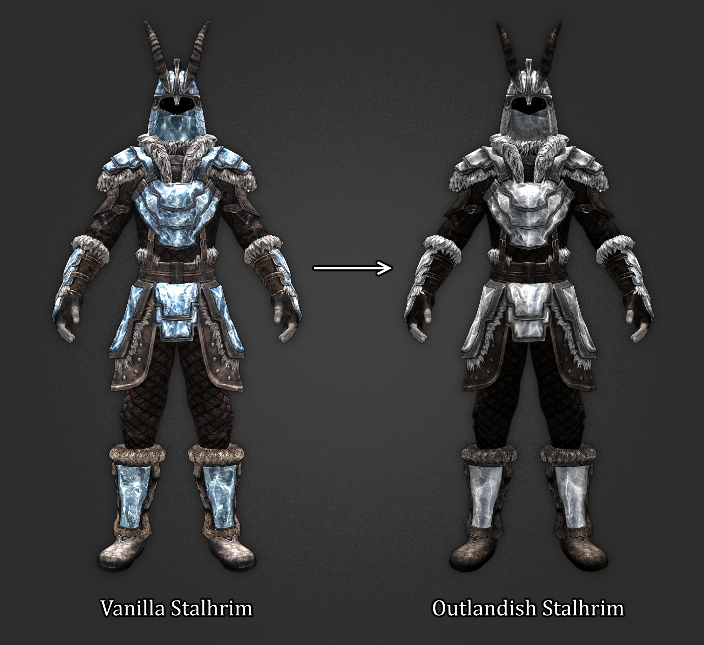 Должен быть совместим с модами, изменяющими меши сталгримовой брони, но тогда она может быть менее светлой.