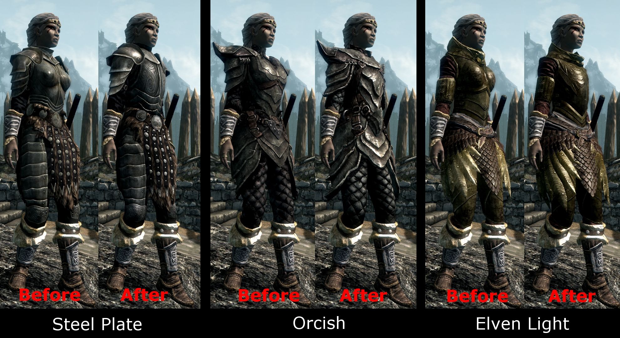 Моды, для которых есть "патчи": "aMidianBorn Glass Armor", "aMidianBorn Differently Ebony", "Gilded Nordic Carved Armor", "Knight Armor - Ebony Armor Edit", "aMidianBorn Content Addon" и "Sleeved Imperials". Также есть пресеты для Bodyslide.