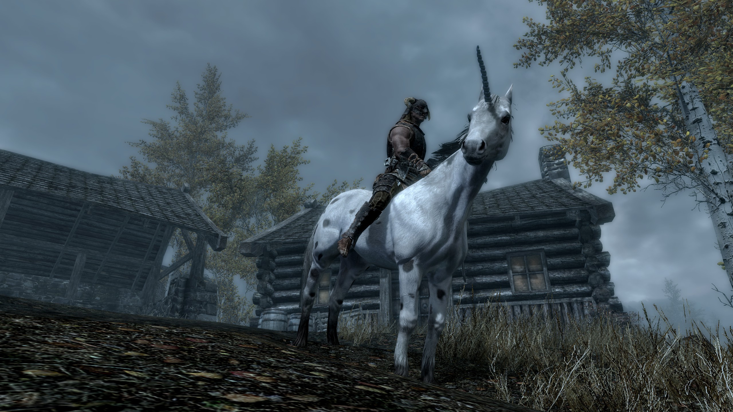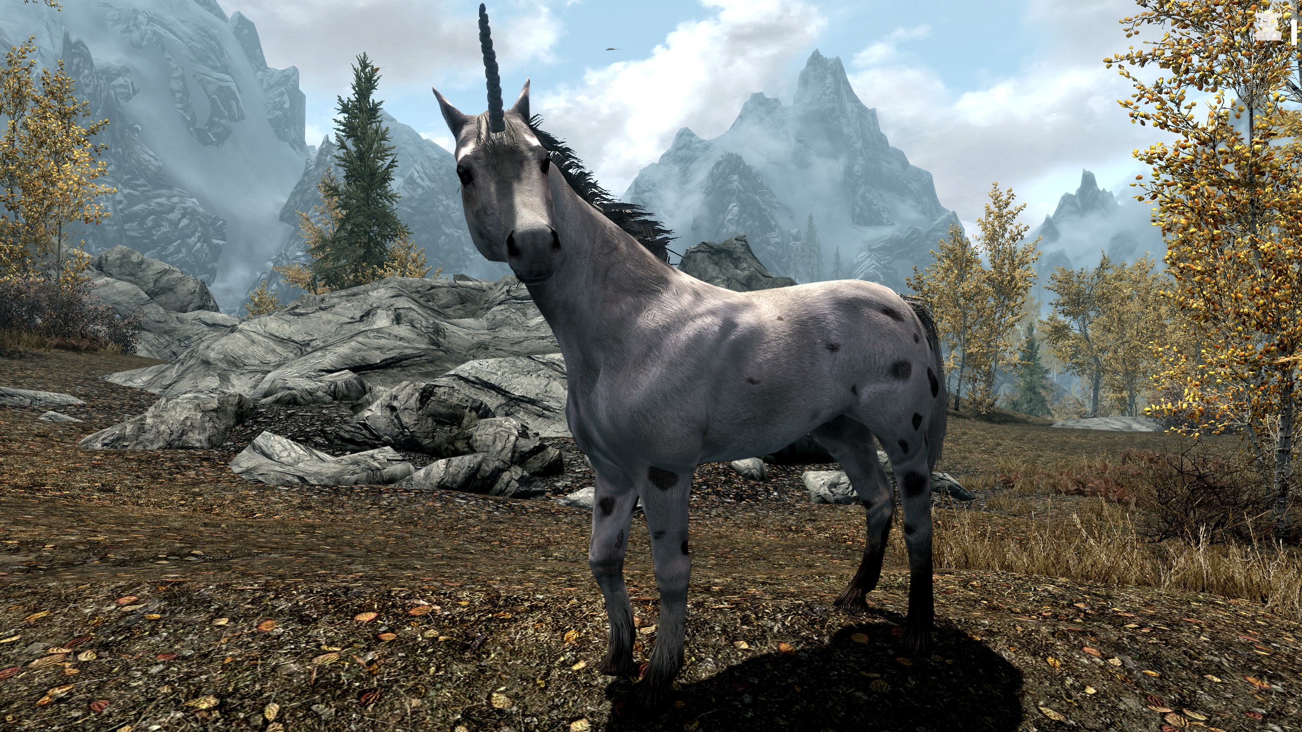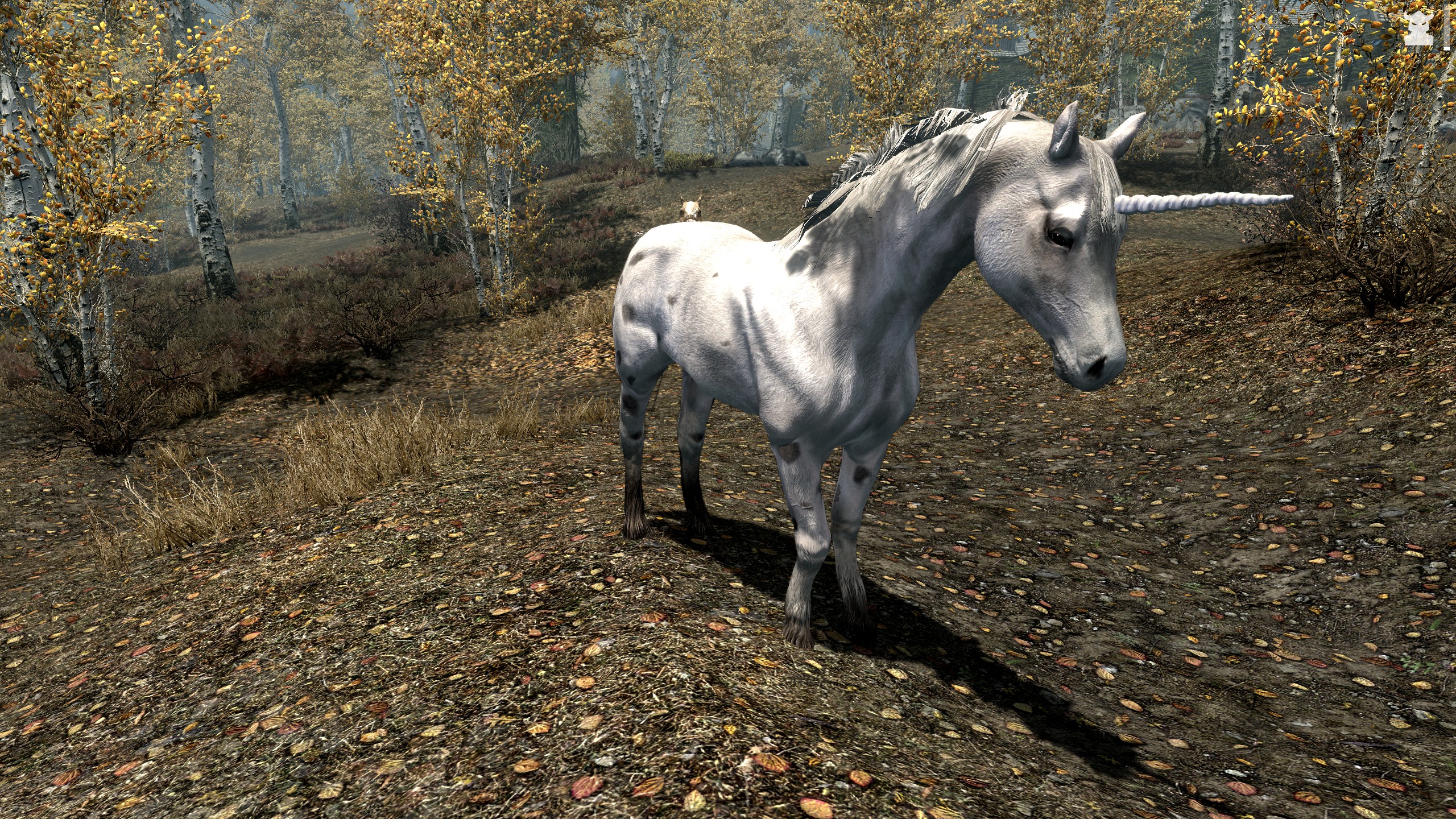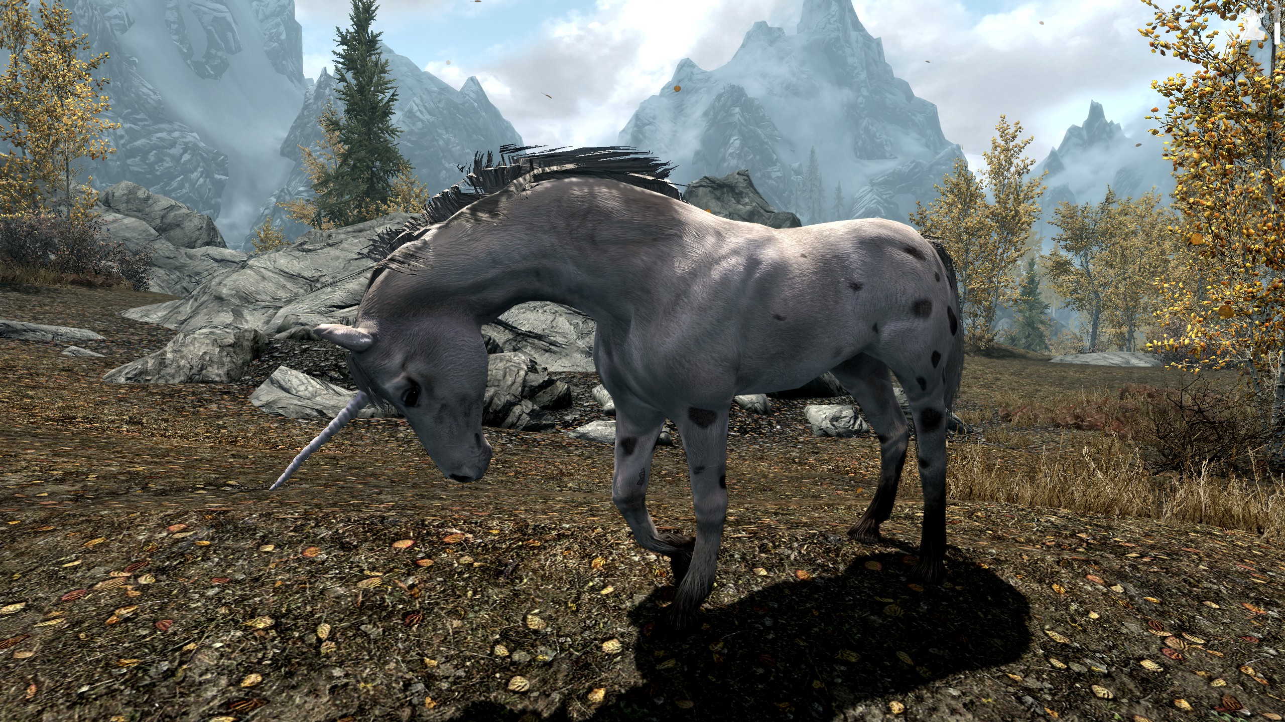 Грациозные единороги являются редко встречающимися мирными низшими даэдра, чей родной план существования - Охотничьи угодья. И хоть они выглядят как простые лошади, не обманывайтесь: каждый единорог является диким и неукрощенным существом, из-за чего они не носят седла, а грива их неопрятна.