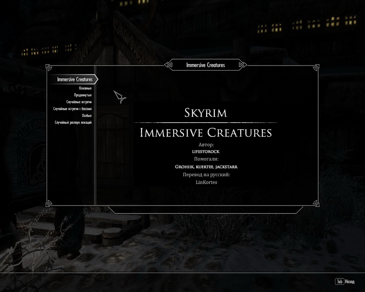 О: Клавиша Esc -> вкладка Система -> Строка Настройка модов -> Там уже выбираем Immersive Creatures