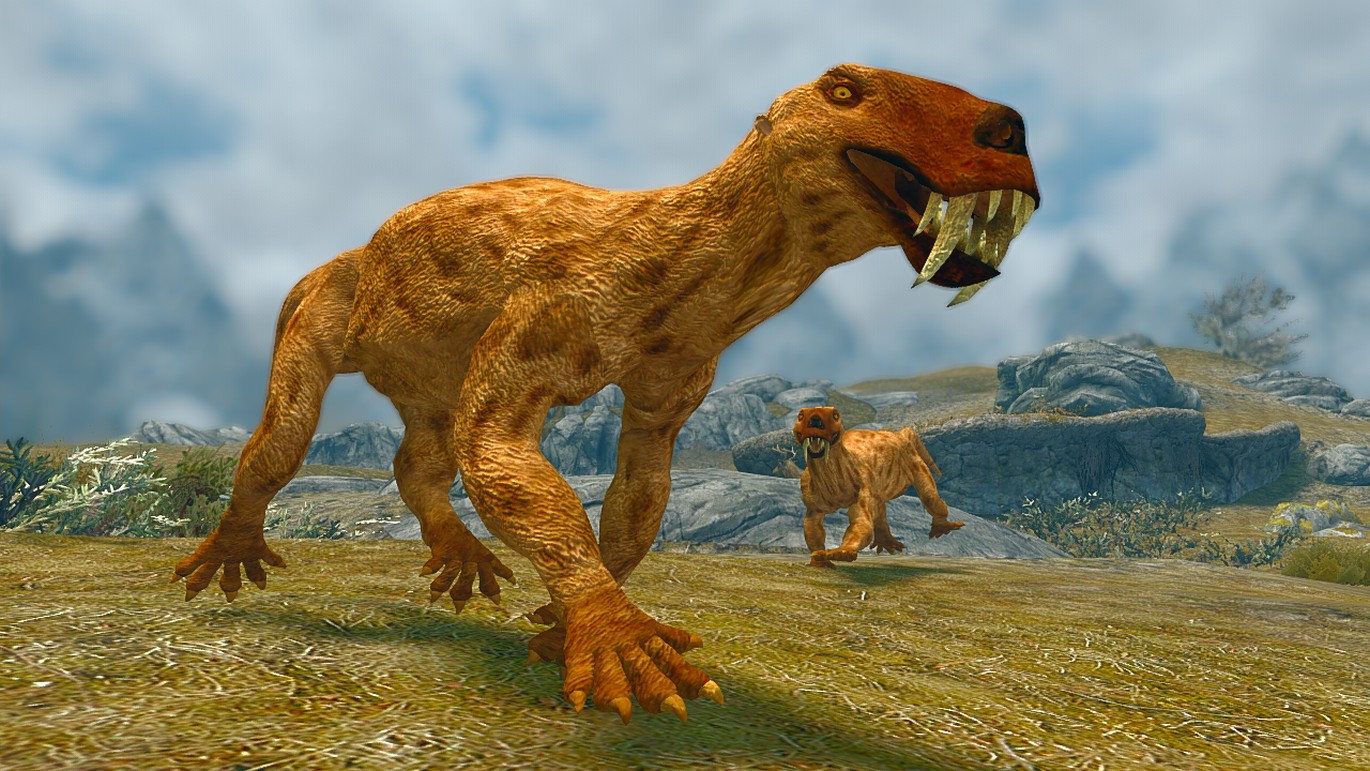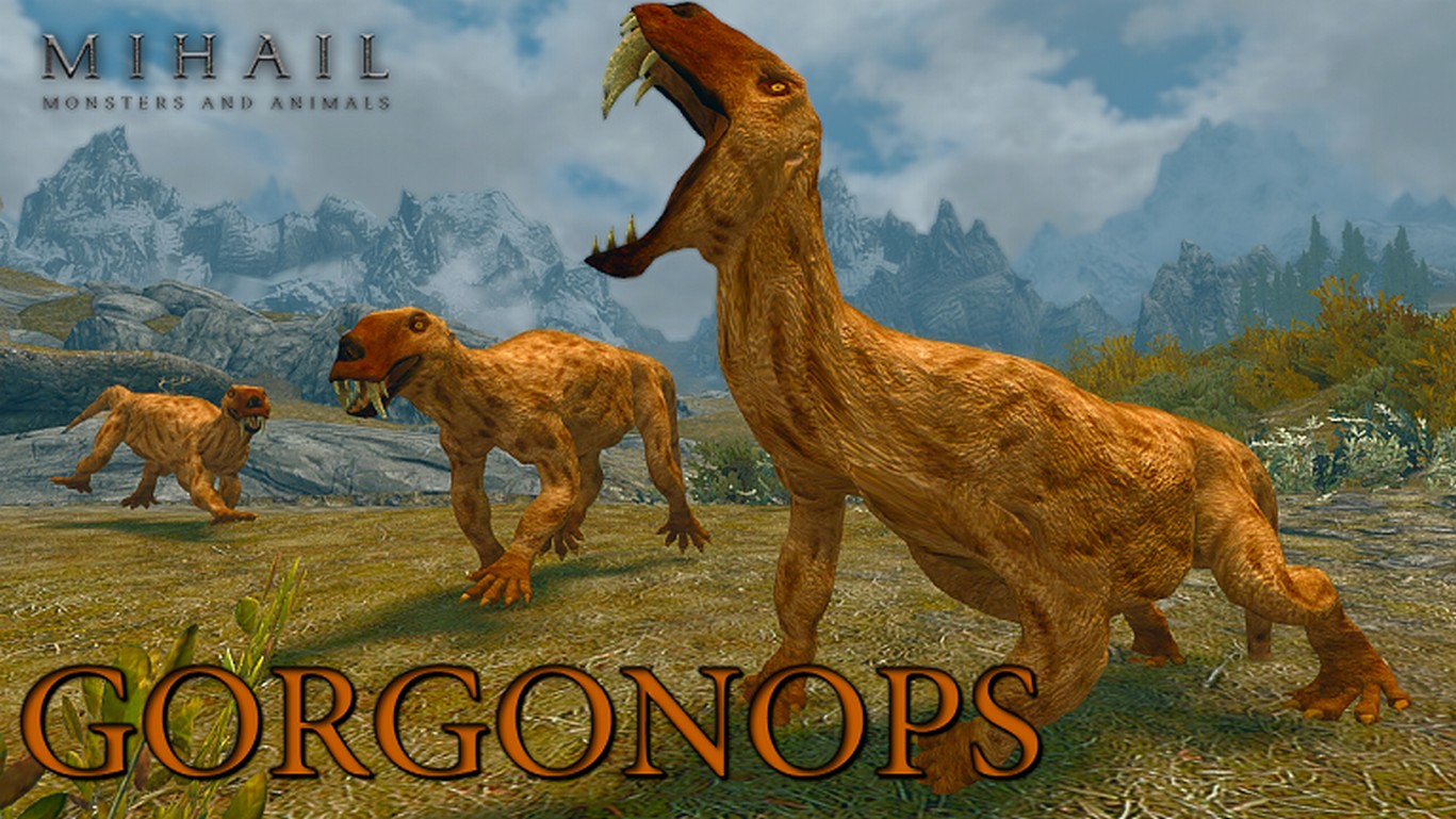 Горгонопсы - это опасные хищники с чертами рептилий и саблезубов. В Скайриме обитают два вида горгонопсом. Это мелкие пятнистые горгонопсы размером в лисицу, которые охотятся группами. Второй вид гигантских горгонопсов размером как два взрослых саблезуба, охотятся по одиночке.