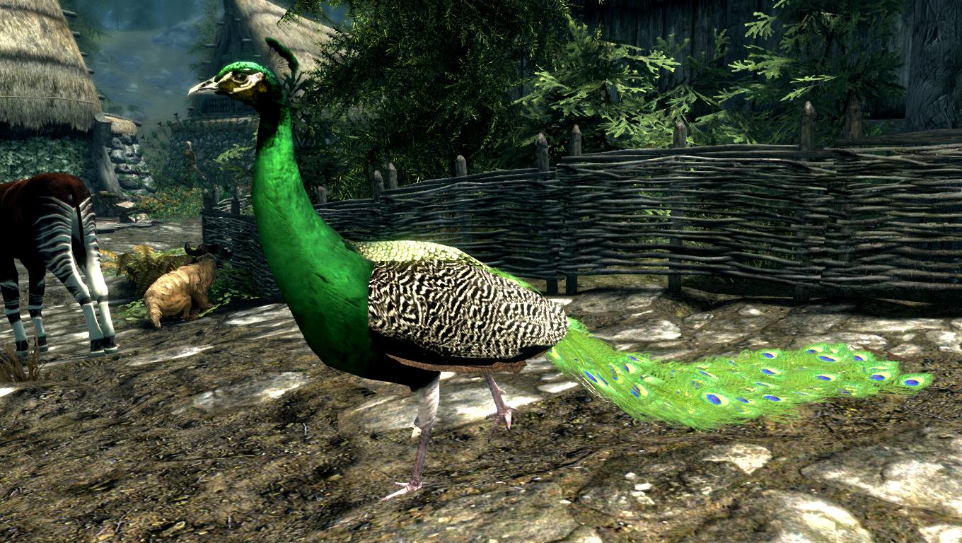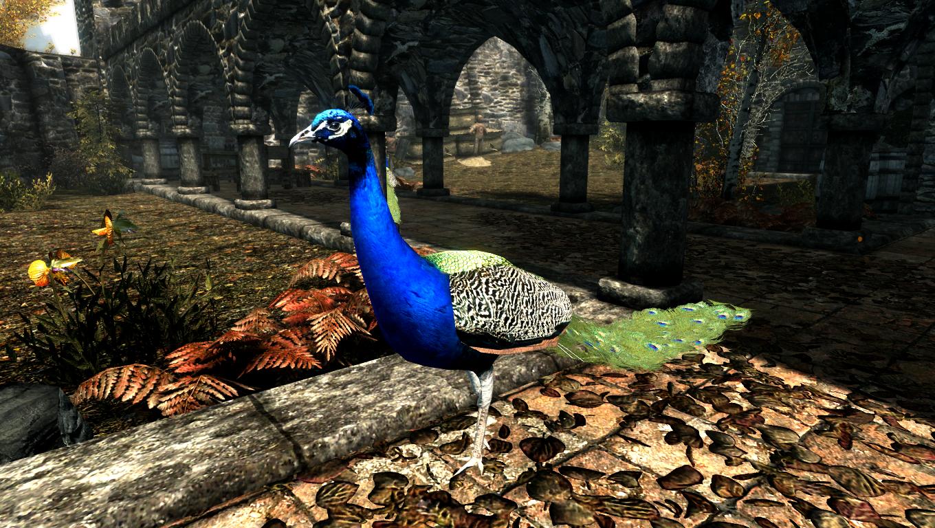 * Мод добавляет в Skyrim LE - Павлинов, они имеют свои собственные звуки и лут.