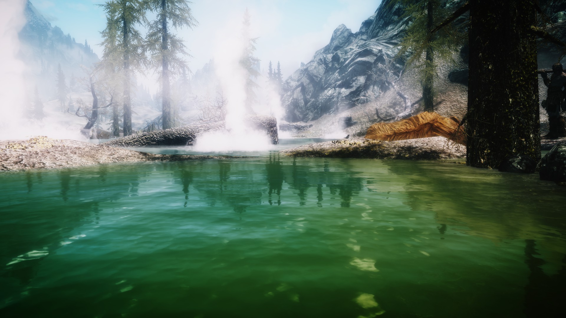 Скрины и видео годные. Огонь, как и должно быть, освещает все ярко-оранжевым светом, а не белым как в предыдущих енб, что я ставил. Мне это нравится. А горы и дальний ланшафт во время пасмурной погоды или крика "грозовой зов" не становятся бестекстурными и вырвиглазными на фоне ясного неба? если да, то это лучший енб, что я видел.