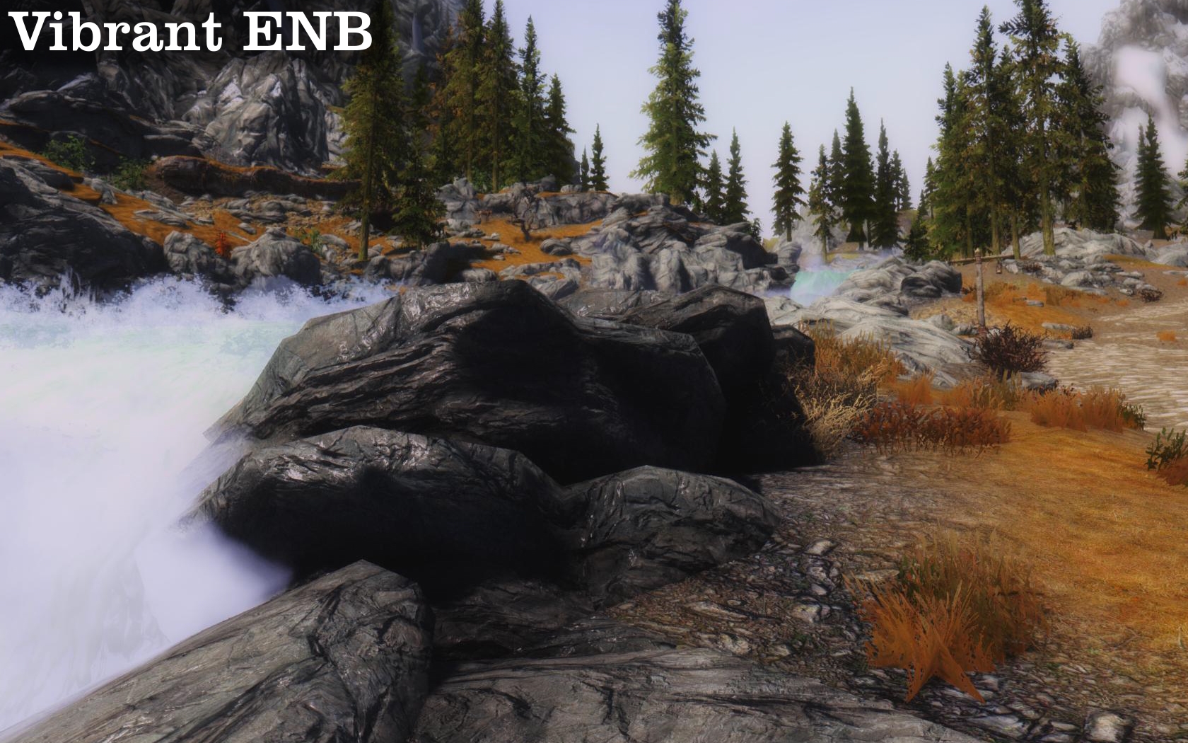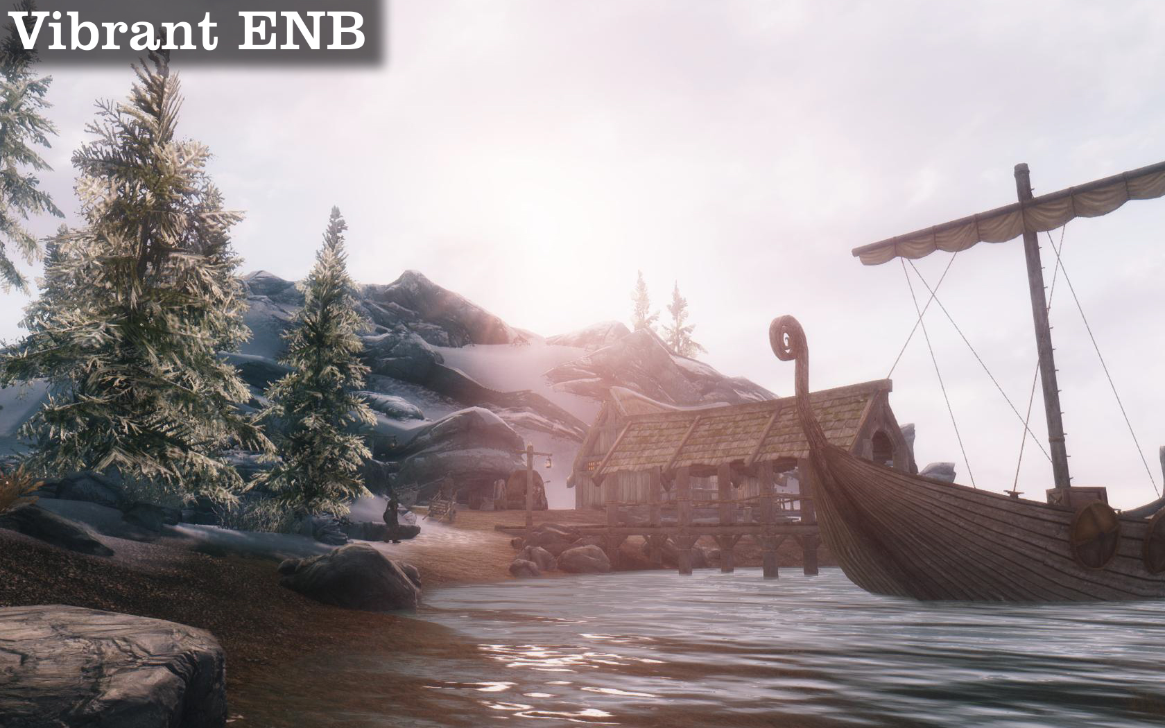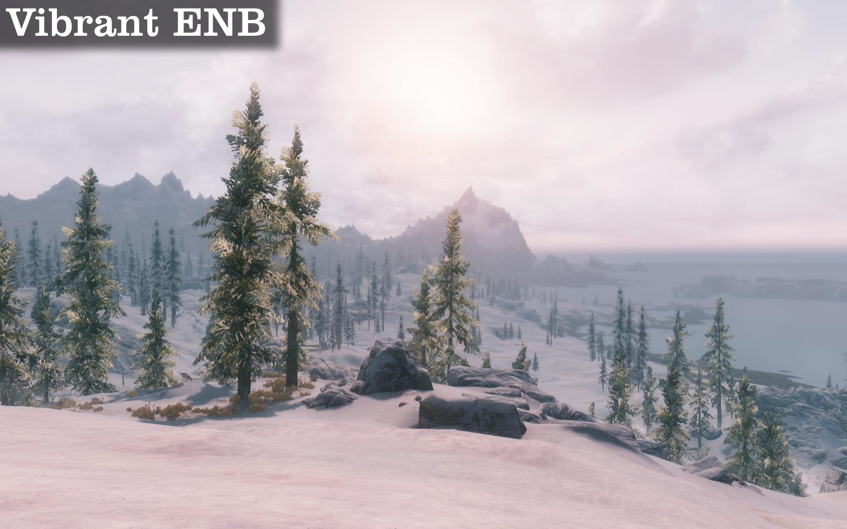Возможные минусы: при некоторых погодных условиях (сильная метель) может довольно сильно выражаться контраст между небом и горами вдали. Попробуйте на закате\рассвете или в сильную непогоду смотреть на дальние горы и отключать\включать ENB и вы поймёте о чем я. Это совсем не критично, но слегка может подпортить картинку. И еще линия горизонта становится более выраженной, что создаёт впечатление будто вы видите конец карты. В оригинале же, грань между водой и небом смазывается туманом.