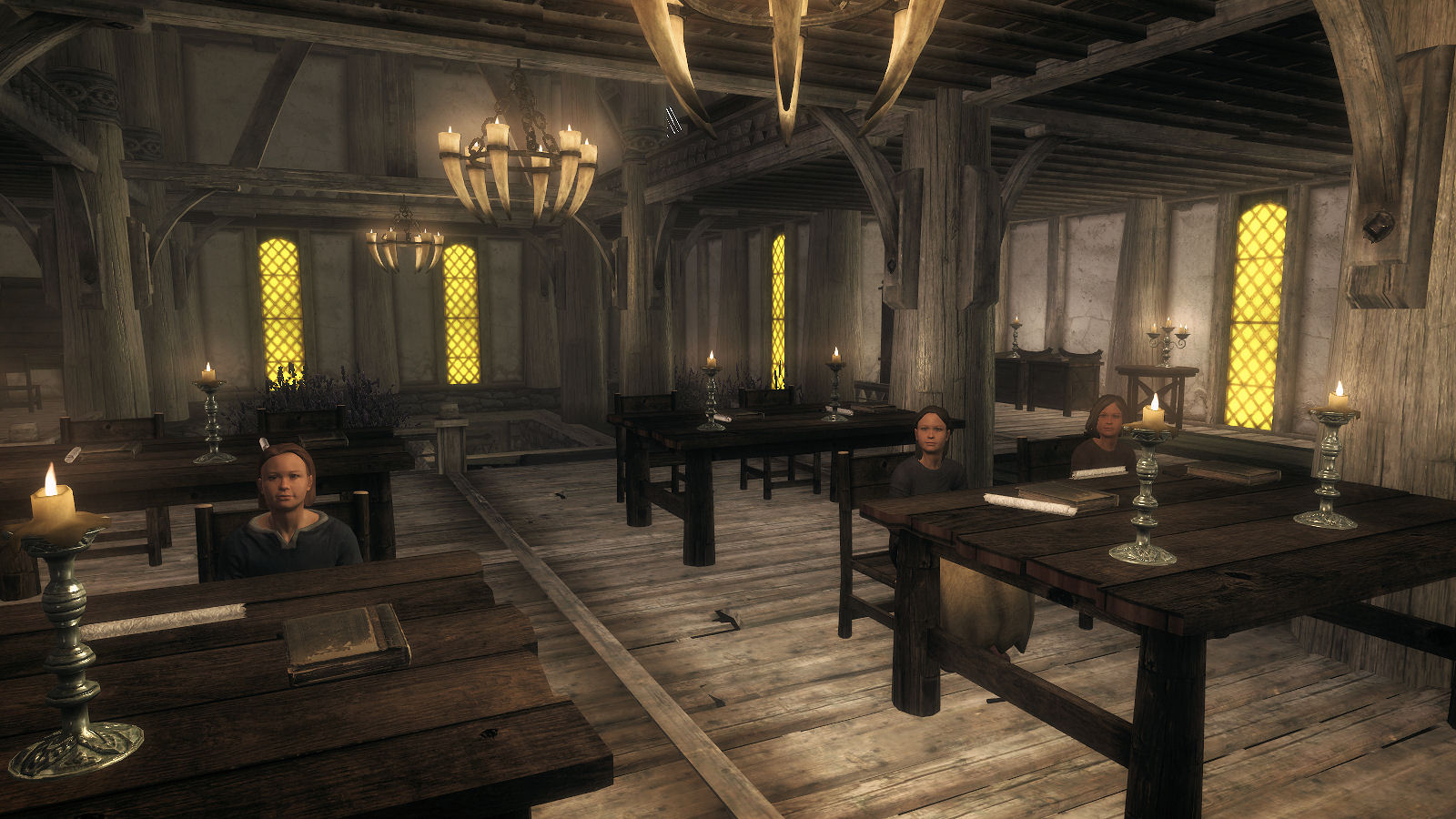 Распорядок дня детишек из Вайтрана был слегка изменен, так что теперь им придется посещать школу пять дней в неделю, а по выходным делать домашние задания. Конечно немного времени на поиграть у них будет, но в целом вас перестанут доставать их крики и замечания. Школьные занятия идут с 7 утра до 3 часов дня. Также в моде добавлена альтмерка Элвинн, которая является преподавателем и хозяйкой школы. Изменение расписания не задевает никаких квестов.