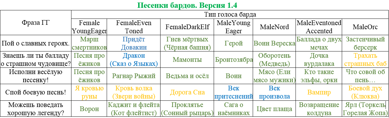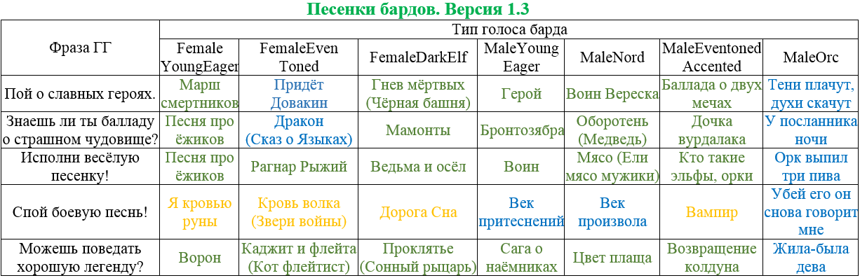 - рекомендую ставить в порядке загрузки после модов, глобально меняющих фразы ГГ, иначе вероятнее всего он/она будет просить у бардов конкретную песню, как в оригинае, а слушать что-то на подобную или не очень тему.
