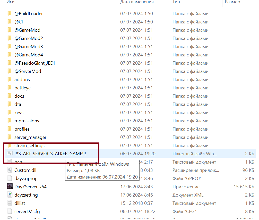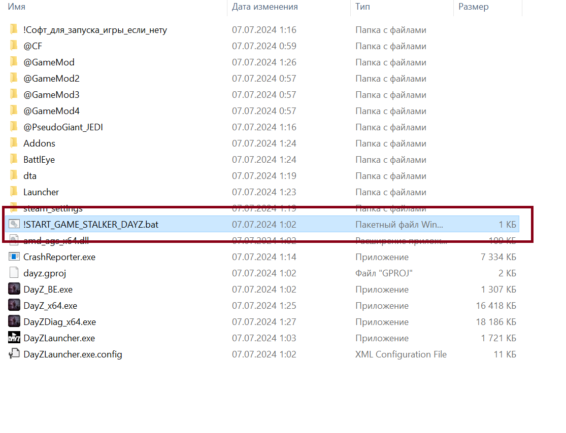 так после старта сервера переходите в папку с игрой и тамже опять жмете батник !START_GAME_STALKER_DAYZ содержание батника start DayZ_x64.exe "-mod=@CF;@GameMod;@GameMod2;@GameMod3;@GameMod4;@PseudoGiant_JEDI"