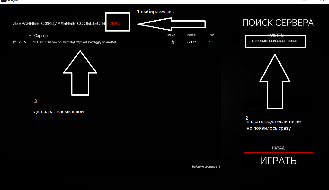 как игра запустится у вас там будет кнопка поменять сервер нажимаете ее и выбираете в списке последнюю строку ЛВС там будет видно только ваш сервер STALKER два раза мышкой клик и вы конектитесь