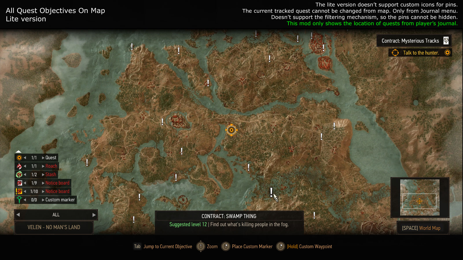 - Standart версия - поддержка пользовательских значков для квестовых меток. Нажмите на метку задания, чтобы изменить текущее задание (или цель) прямо с карты. Добавляет дополнительные изменения в mapMenu.ws файл, а также изменяет panel_worldmap.redswf файл.