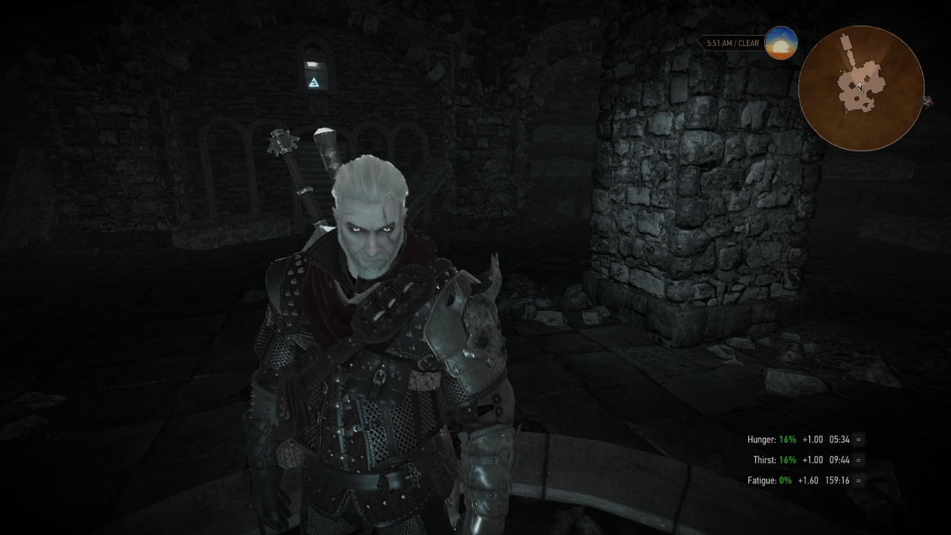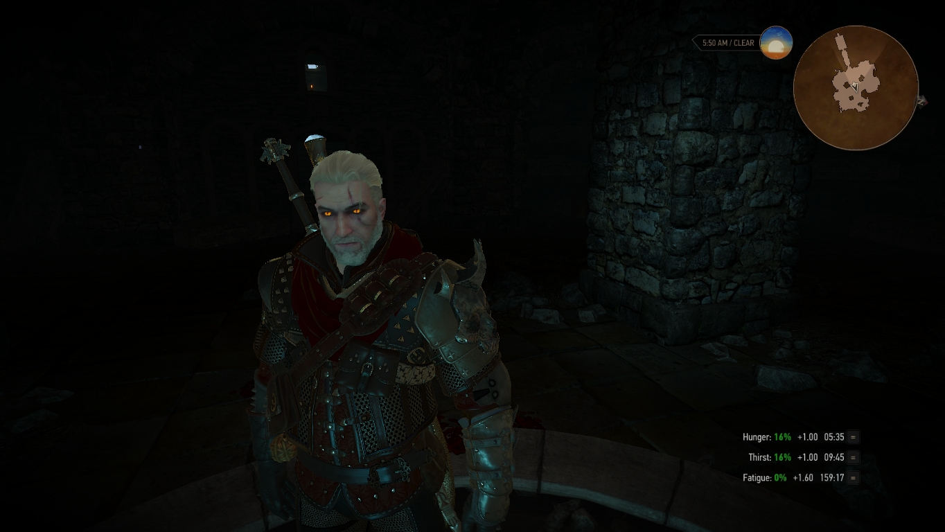- Darker night — для тех, кто использует мод Darker nights — если ведьмачье чутьё активировано, эффект кошачьего зрения активируется ночью между 22 и 4 часами. Также он будет активироваться в тёмных участках. Время активации эффекта можно изменить с помощью настроек мода Darker nights.