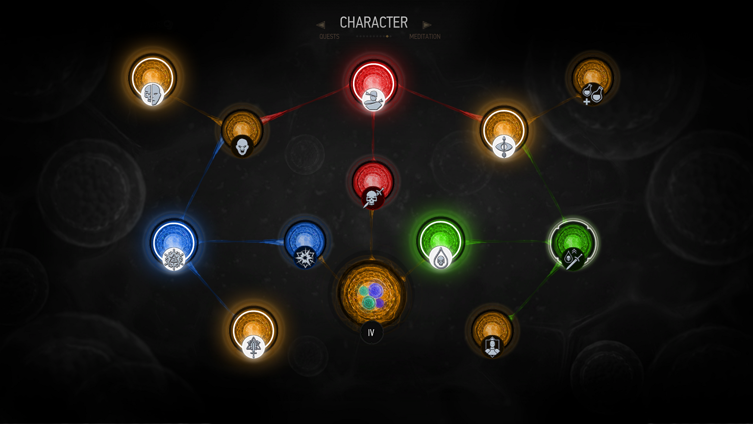 8 вкладок со слотами умений и мутагенов; минимальные требования к уровню персонажа; только первые три вкладки навыков будут давать бонусы синергии мутагенам;