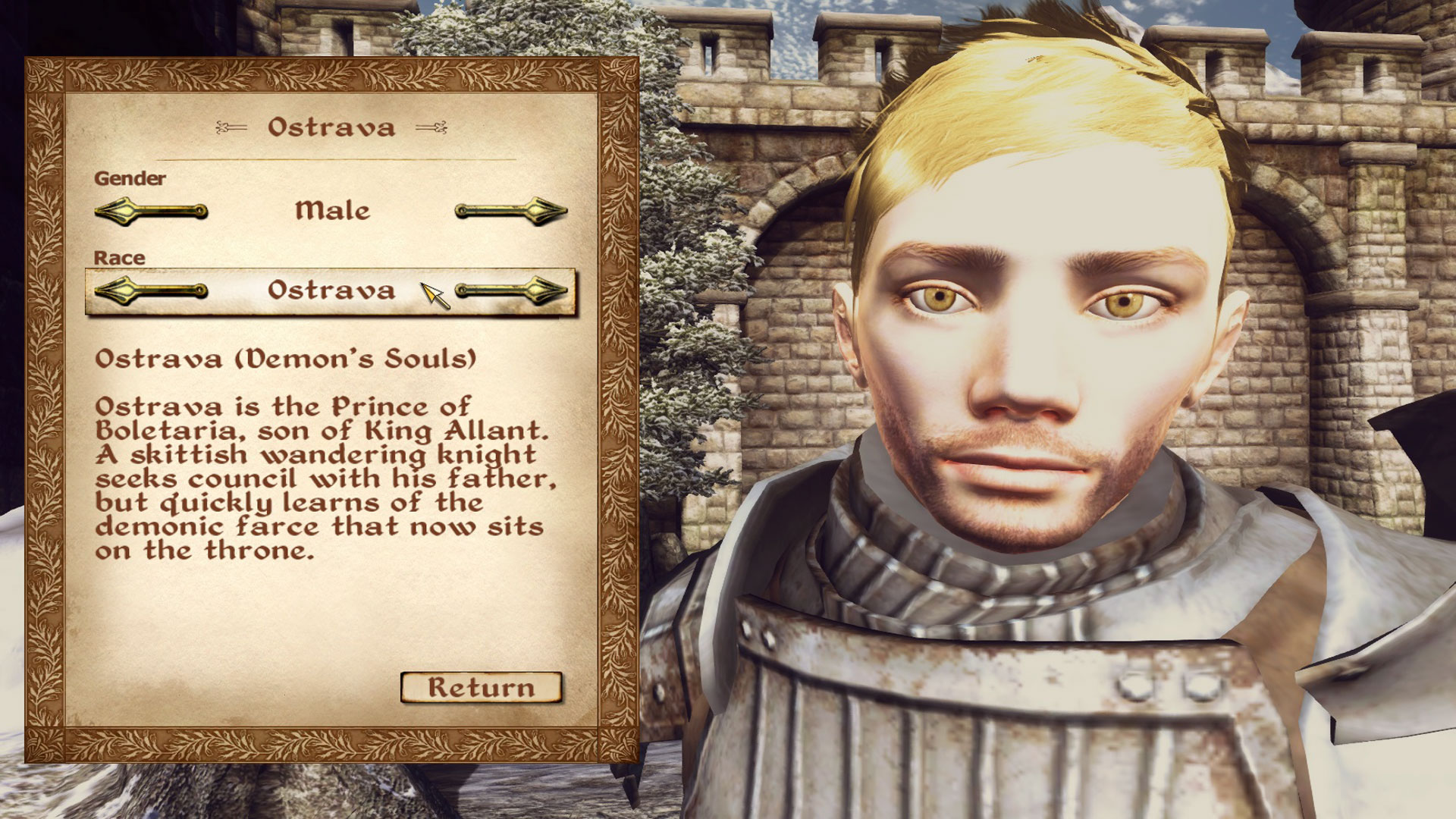 - Full armor & weapon that Ostrava wears in the Demon's Souls game directly from him; if you kill him, or make him your companion then trade his inventory.